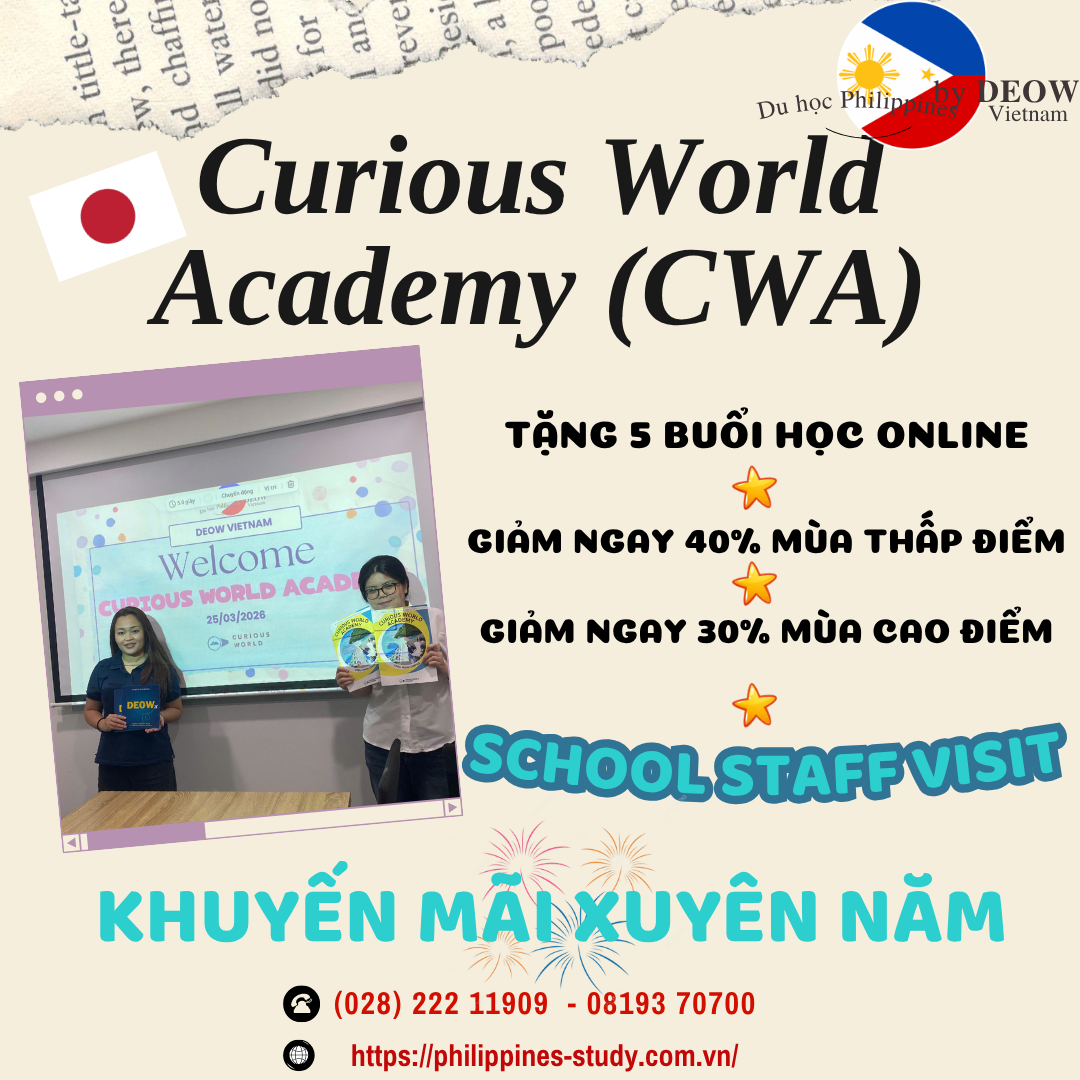 Trường Anh ngữ Curious World Academy (CWA) là trường chuyên giảng dạy tiếng Anh tại Philippines do người Nhật Bản sáng lập và phát triển. Trường tọa lạc tại trung tâm thành phố Cebu với cơ sở vật chất tựa như một khách sạn sẽ giúp học viên có những trải nghiệm thật tuyệt vời khi đến đây học tập.