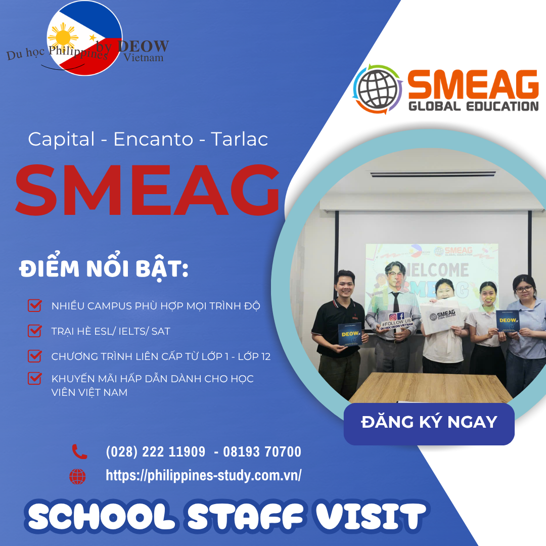 SMEAG Global Education là một trong những trường giảng dạy Anh ngữ lớn nhất và uy tín nhất tại Philippines hiện nay. Trường gồm nhiều campus phục vụ nhu cầu học tập của nhiều đối tượng học viên ♥️