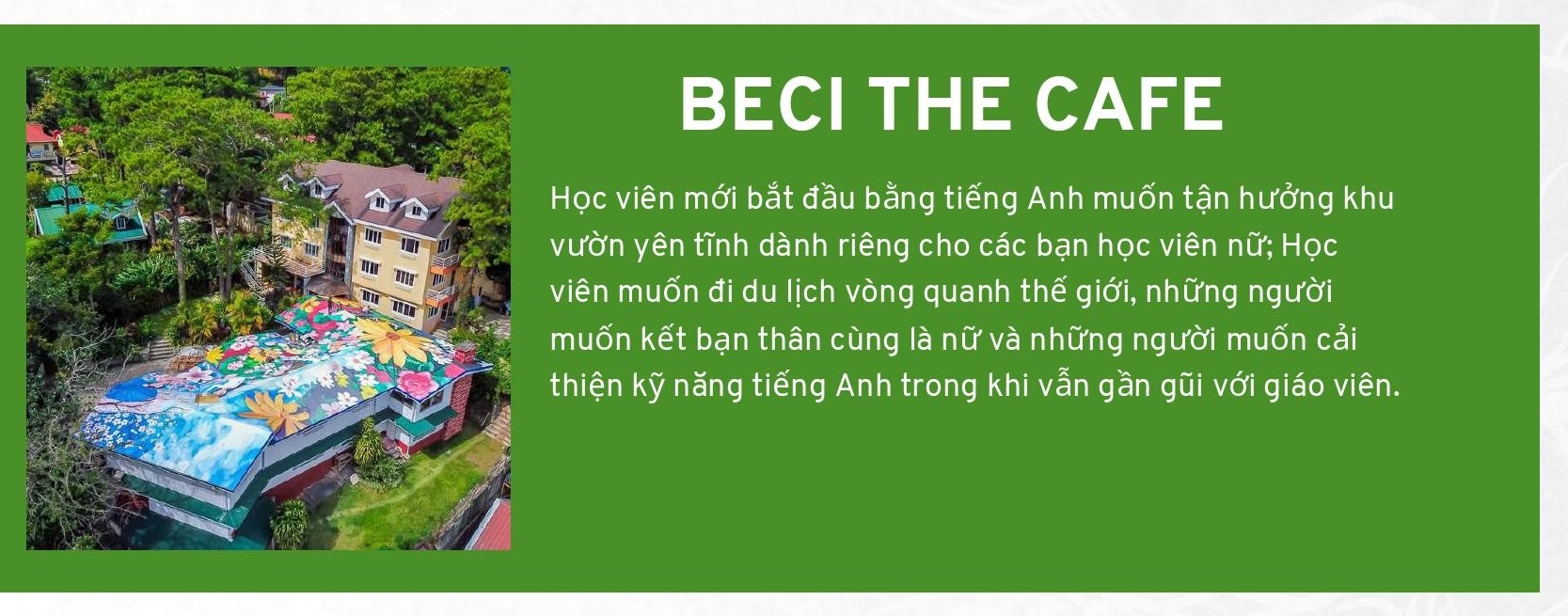 BECI THE CAFE, Cơ sở thứ 2 của API BECI là trường ngoại ngữ quốc tế đầu tiên chỉ dành cho phụ nữ. Chúng tôi cung cấp cho học viên một môi trường dễ chịu tập trung giáo dục để giao tiếp bằng tiếng Anh. Dưới 50 học viên, tất cả các học viên có thể gần gũi hơn và cảm thấy rằng BECI không chỉ là một trường học, mà còn là ngôi nhà thứ hai của họ.