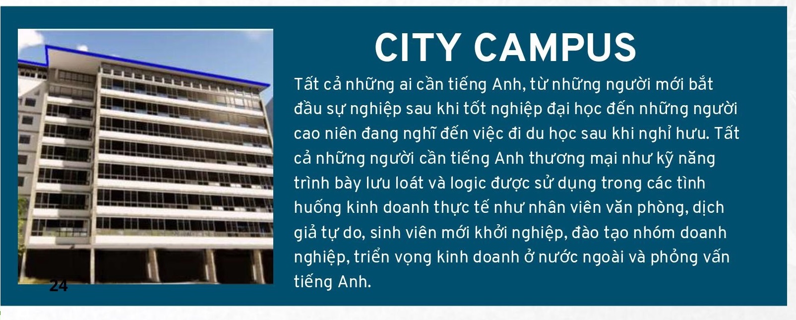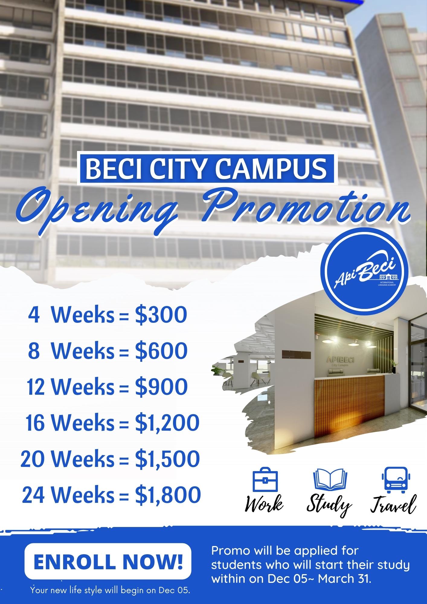 BECI CITY CAMPUS cung cấp các chương trình giảng dạy đa dạng cho những ai muốn học tiếng Anh kết hợp làm việc nghỉ dưỡng. Phỏng vấn đánh giá trình độ tiếng Anh (trực tuyến) sẽ được thực hiện bởi người quản lý quốc gia của bạn trước khi bạn đến trường. Nhờ vậy lịch học cũng như các môn học sẽ được xác định trước khi nhập học.