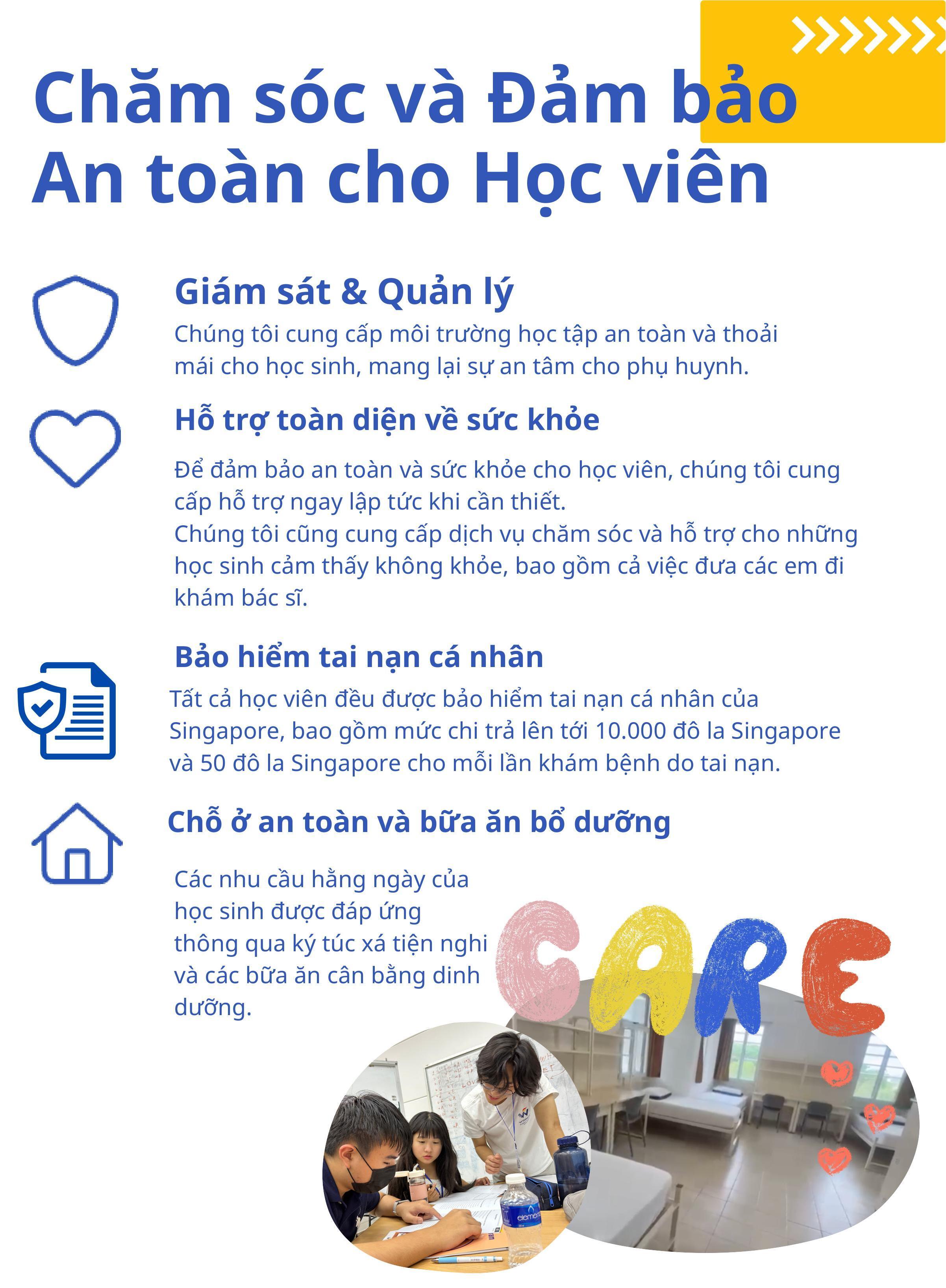 Hỗ trợ toàn diện về sức khỏe: Có đội ngũ hỗ trợ ngay lập tức khi học sinh cần; chăm sóc và đưa học viên đi khám bác sĩ khi không khỏe.