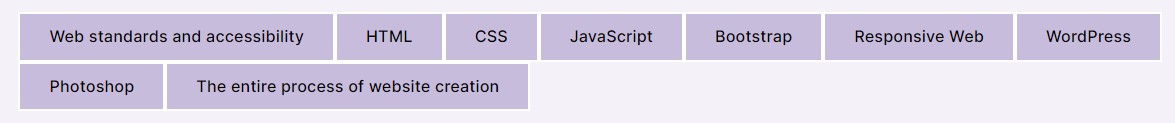 | JavaScript | Basic syntax, variables, data types, control structures, functions, DOM manipulation, jQuery, and other JavaScript libraries |