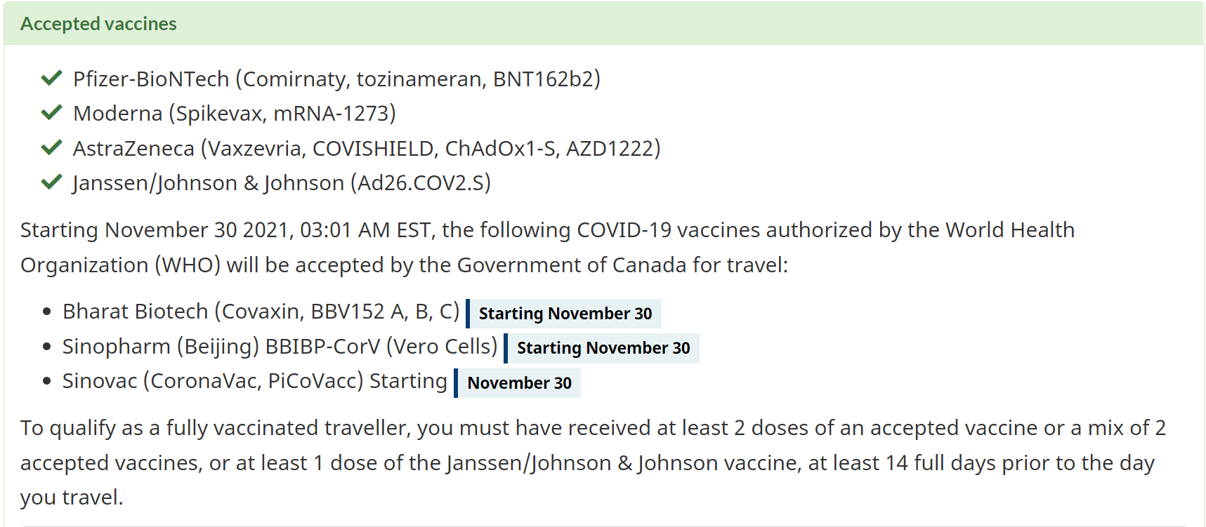 Những loại vaccine được chấp nhận tại Canada bắt đầu từ ngày 30/11/2021: