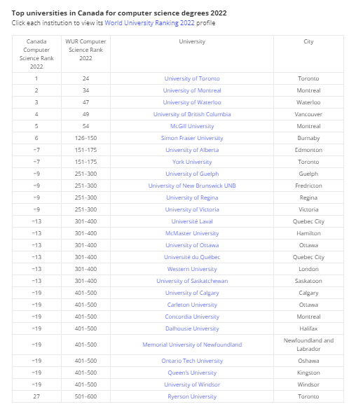Theo tờ Times Higher Education, trang web nổi tiếng với các bảng xếp hàng các trường đại học tốt trên toàn thế giới đã đưa ra top 27 trường đại học tốt đào tạo ngành Computer Science tại Canada.