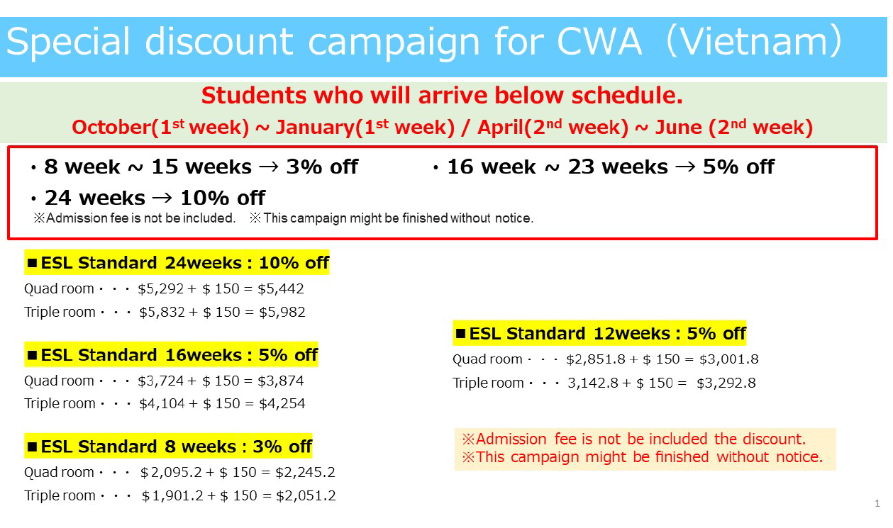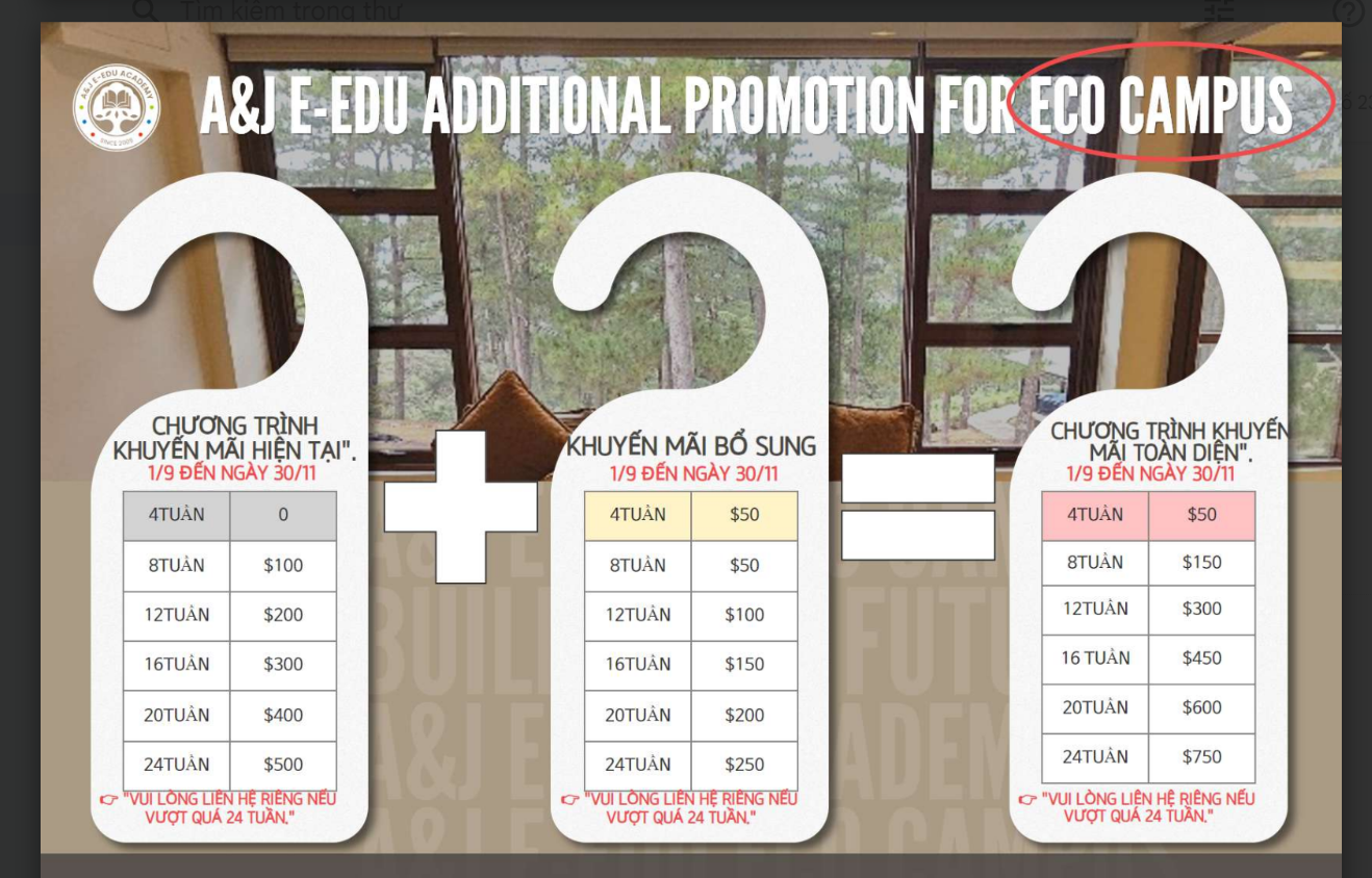 Trường không áp dụng giá ưu đãi này cho Giai đoạn nhập học: (Thay vào đó KH vui lòng nhận ưu đãi từ DEOW)