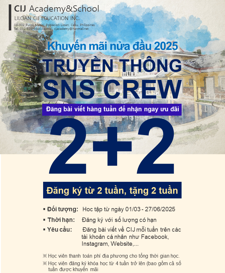 Điều kiện : Đăng bài trên các tài khoản SNS và trên trang truyền thông của công ty sau khi hoàn thành việc viết bài đánh giá trường CIJ theo tiêu chuẩn trước khi kết thúc khóa (Học viên cần đóng thêm 2.000 peso tiền đặt cọc, số tiền này sẽ được trả lại sau khi hoàn thành đánh giá đào tạo)