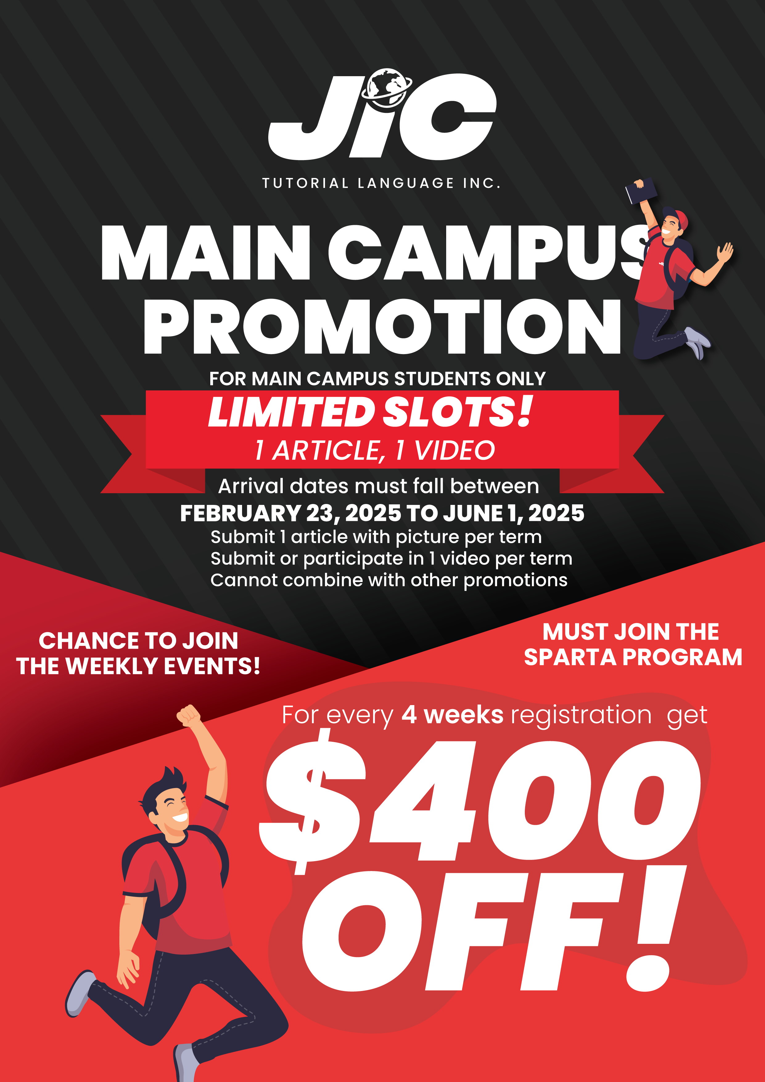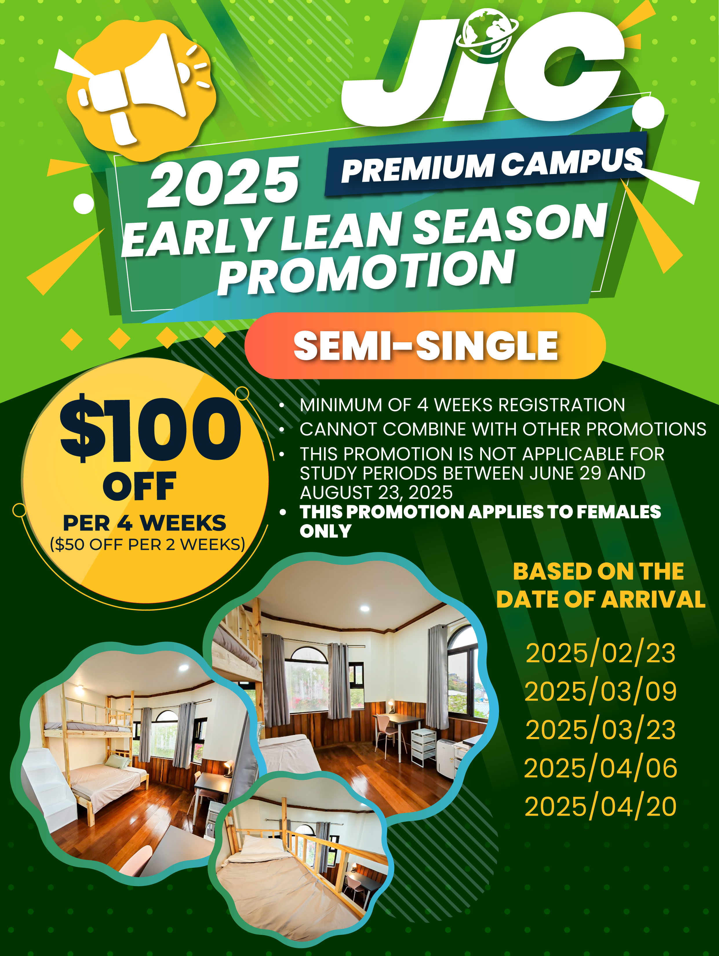 CIJ đã chuẩn bị chương trình khuyến mãi "Happy Smile" từ ngày 20/05/2024 cho đến hết nửa cuối mùa 2024 (Ngày 01/09 đến 28/12) nhằm mang lại cơ hội tốt hơn học viên có nhu cầu chuẩn bị và học tập ngoại ngữ. Trong suốt thời gian như trên, các học viên sẽ được hỗ trợ giảm giá 50% chi phí Ký túc xá.