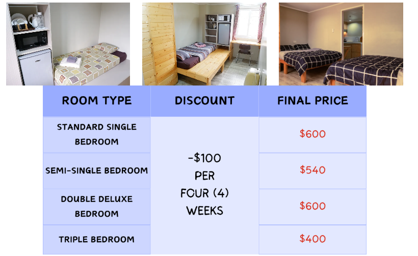 *Không áp dụng cho phòng đơn, ký túc xá bên ngoài hoặc thời gian nhập học dưới bốn tuần*