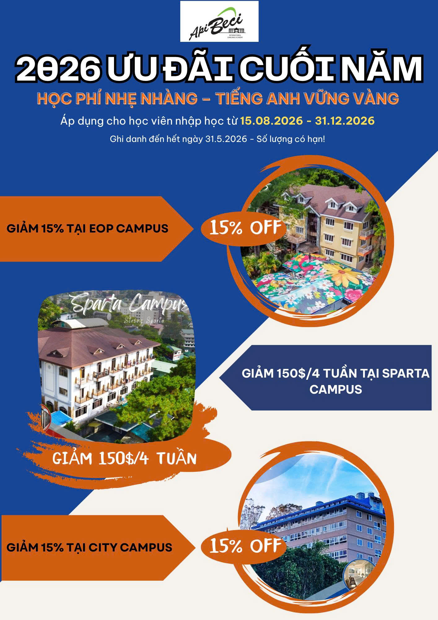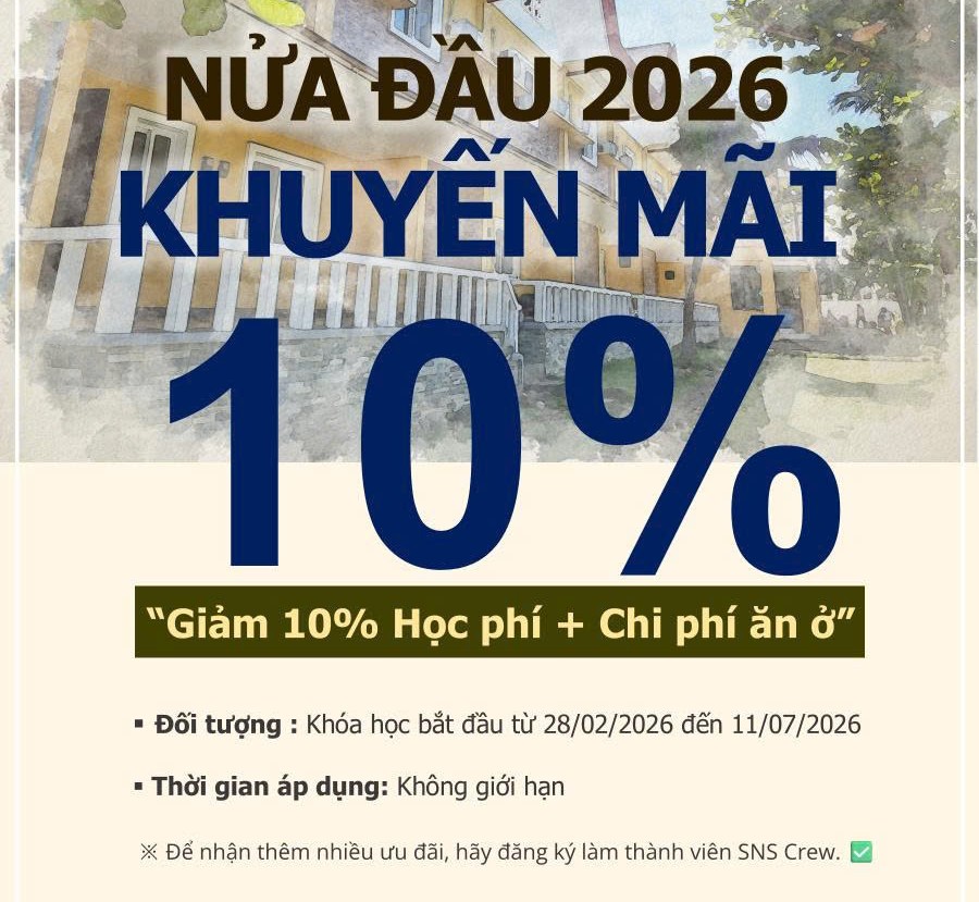- Giảm 50% trên tổng học phí + ký túc xá (áp dụng tất cả các khóa học, các loại phòng) - Không gồm phí đăng ký $120.