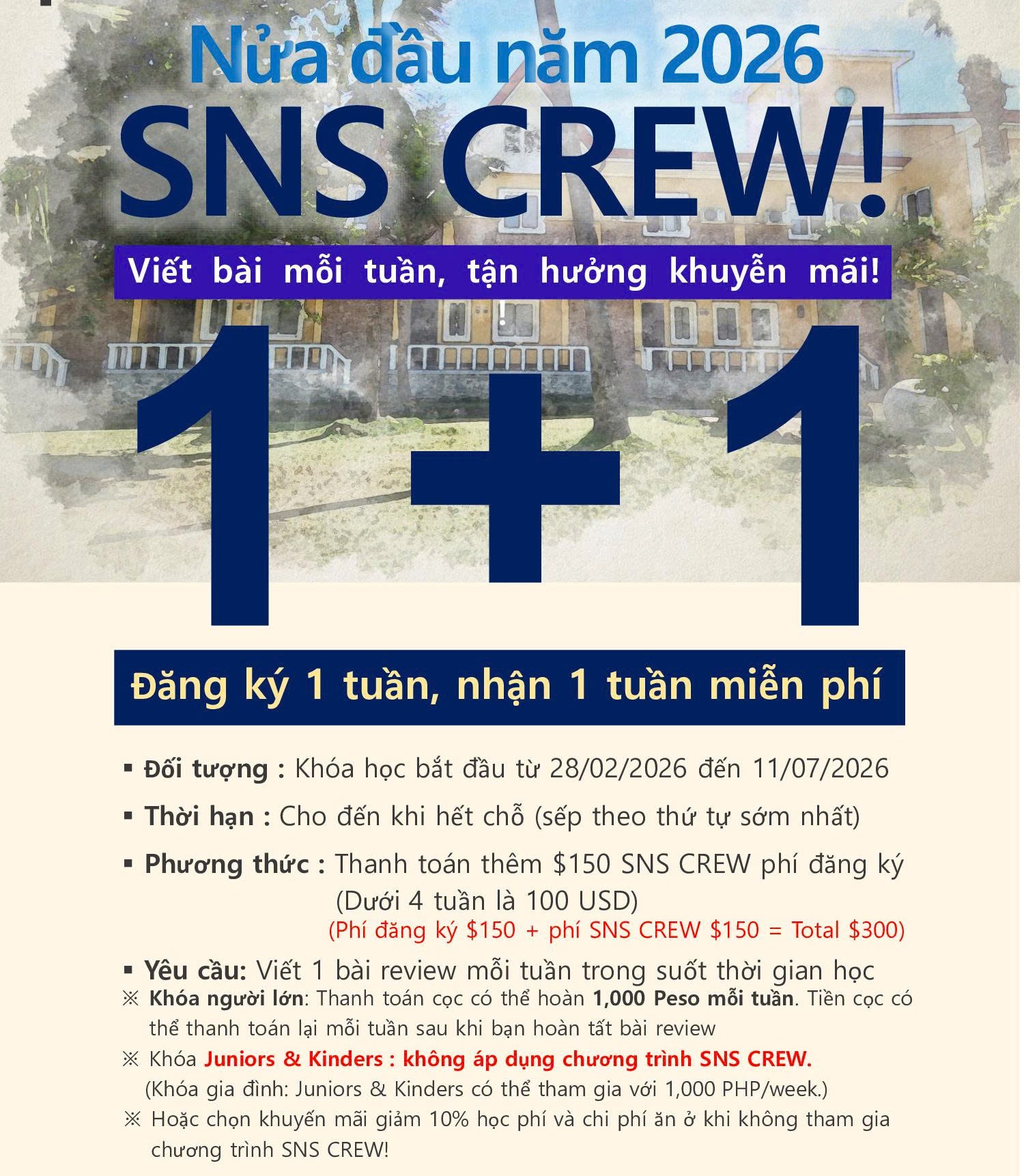 - Thanh toán toàn bộ local fee cho tổng thời gian đăng ký. (Không áp dụng chương trình giảm 2,000peso/4wks)