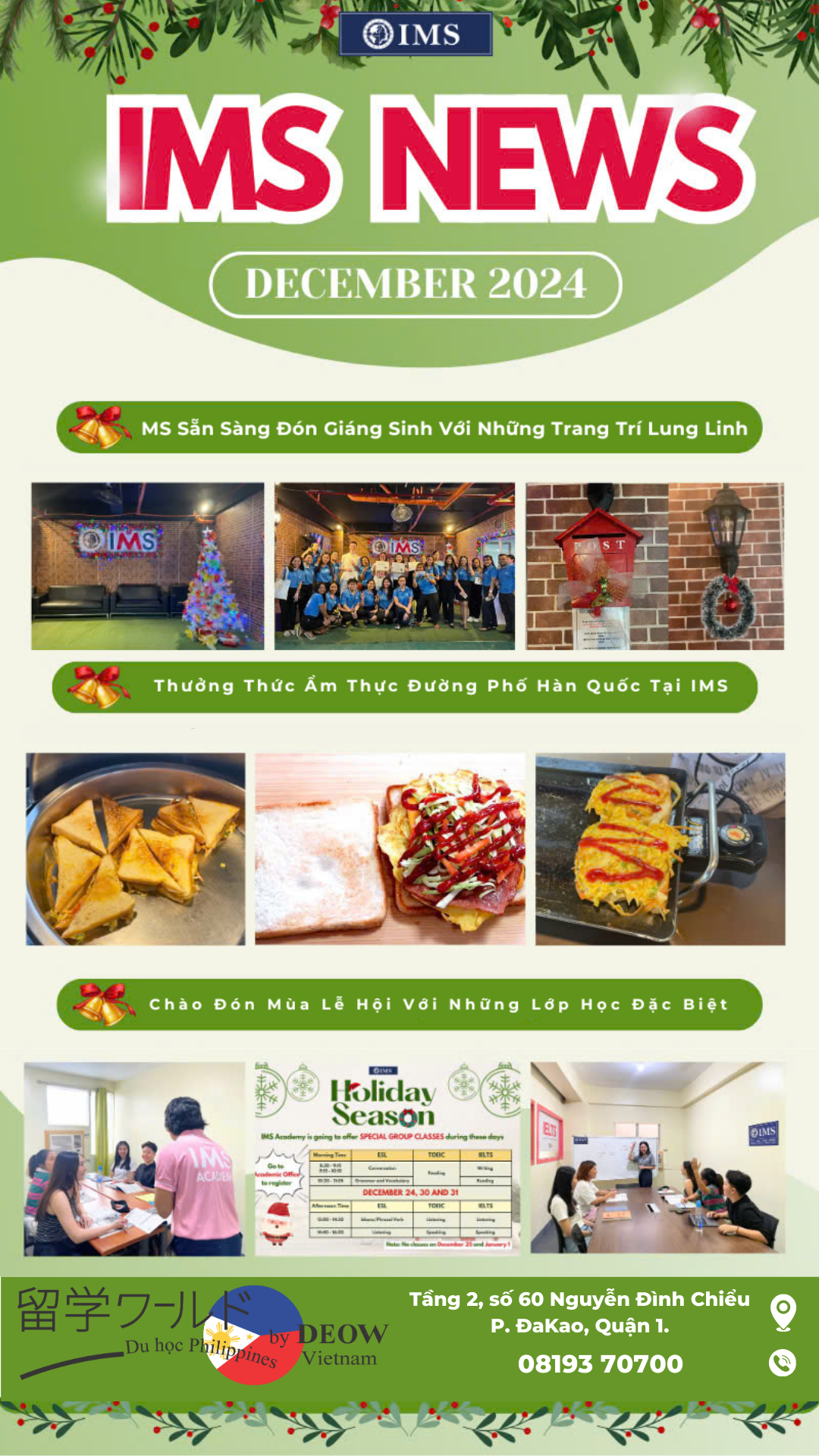 IMS rất vui mừng thông báo về các lớp học Giáng Sinh đặc biệt vào ngày 24, 30 và 31 tháng 12. Đây là cơ hội tuyệt vời để các bạn học sinh vừa tận hưởng không khí lễ hội vừa học hỏi những kỹ năng quan trọng. Các lớp học sẽ mang đến một trải nghiệm học tập toàn diện, tập trung vào cả kiến thức và phát triển kỹ năng. Hãy tham gia cùng IMS để có một mùa lễ hội ý nghĩa và thú vị, nơi bạn có thể phát triển và học hỏi trong môi trường vui vẻ và chuyên nghiệp.