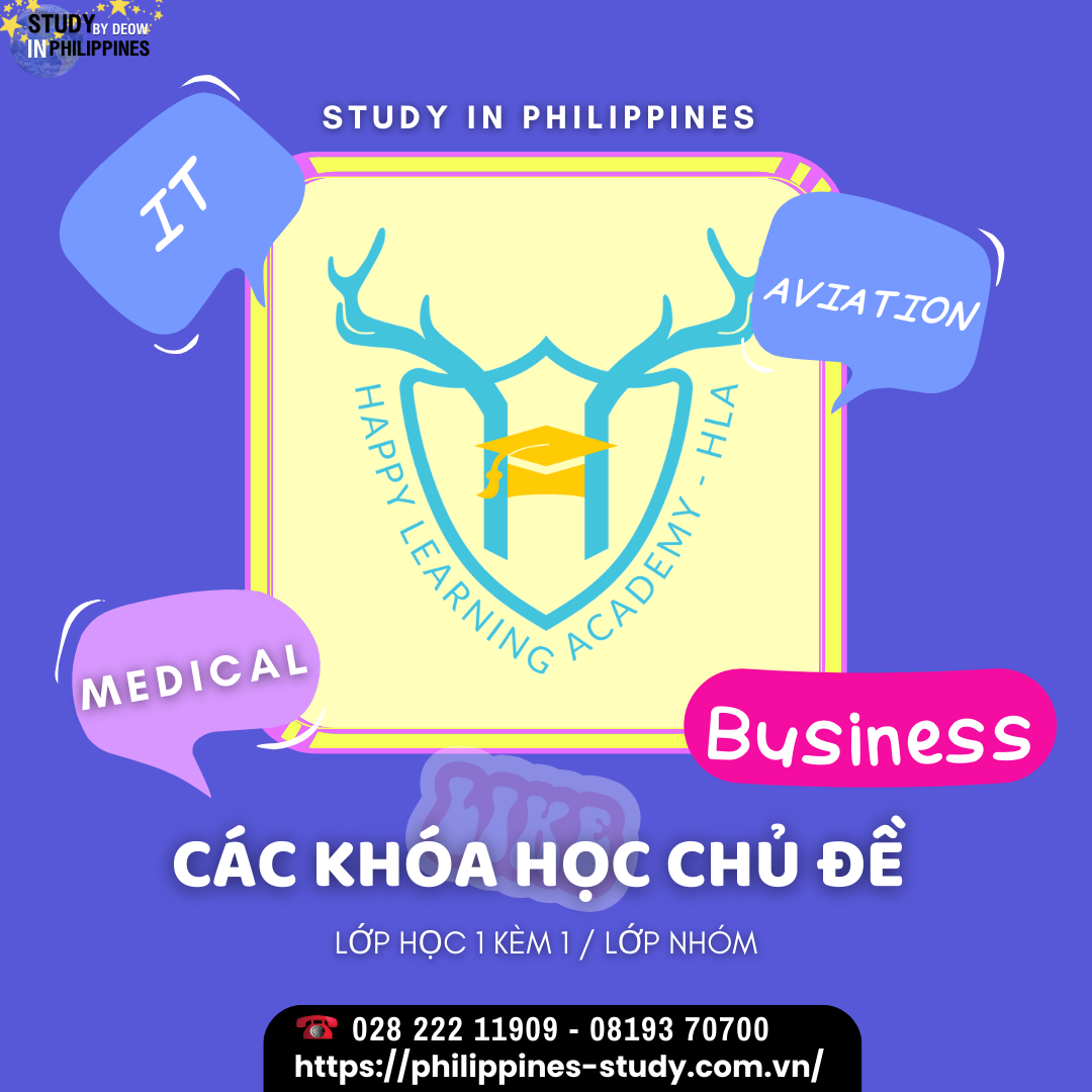 Trường Anh ngữ Happy Learning Academy (HLA) là trường Anh ngữ do người Việt Nam đầu tư và phát triển đầu tiên tại Philippines. Trường cung cấp các khóa học tiếng Anh phù hợp với nhu cầu học tập của nhiều đối tượng học viên. Nổi bật hơn cả với các khóa học tiếng Anh theo chủ đề cụ thể như chủ đề Kinh doanh, Dược, Công nghệ thông tin,…Khóa học giúp học viên có được những kiến thức tiếng Anh để đáp ứng được nhu cầu làm việc tại một lĩnh vực cụ thể.