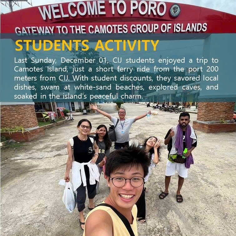 Chủ Nhật tuần trước, ngày 1/12, các sinh viên CIJ đã tận hưởng chuyến đi đến Đảo Camotes, chỉ cách cảng CIJ 200 m một chuyến phà ngắn. Với mức giảm giá dành cho sinh viên, họ thưởng thức hương vị địa phương món ăn, bơi lội trên bãi biển cát trắng, khám phá hang động và đắm mình trong vẻ đẹp yên bình của hòn đảo.