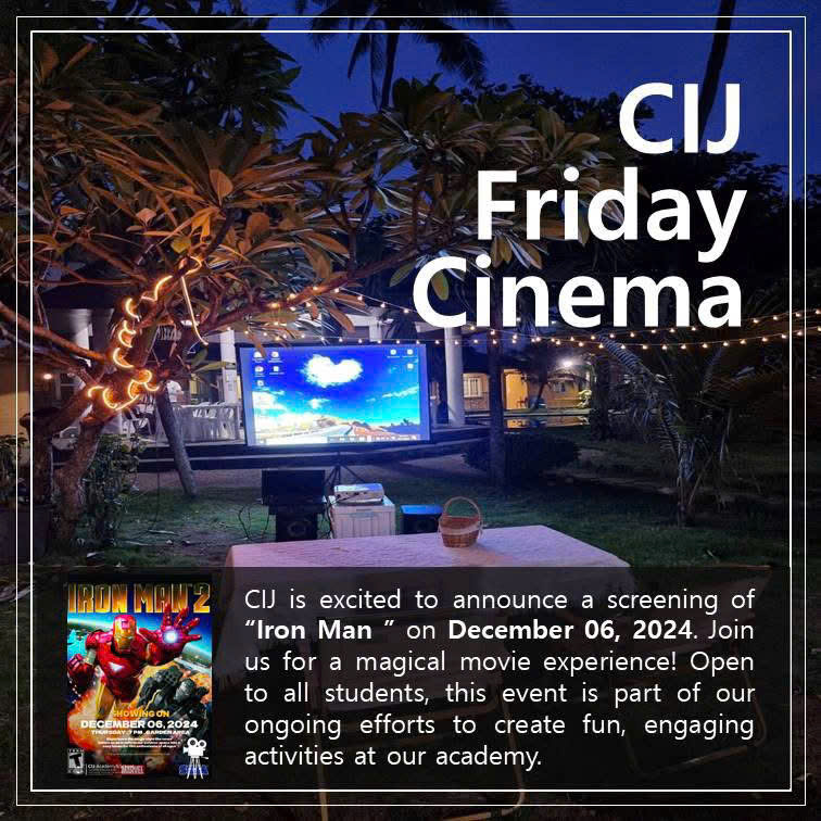 CIJ có buổi chiếu phim "Iron Man" vào ngày 6/12/2024. Hãy cùng chúng tôi trải nghiệm bộ phim kỳ diệu! Buổi chiếu phim dành cho tất cả học sinh, là một phần trong nổ lực liên tục của chúng tôi nhằm tạo ra các hoạt động vui vẻ, hấp dẫn tại học viện.