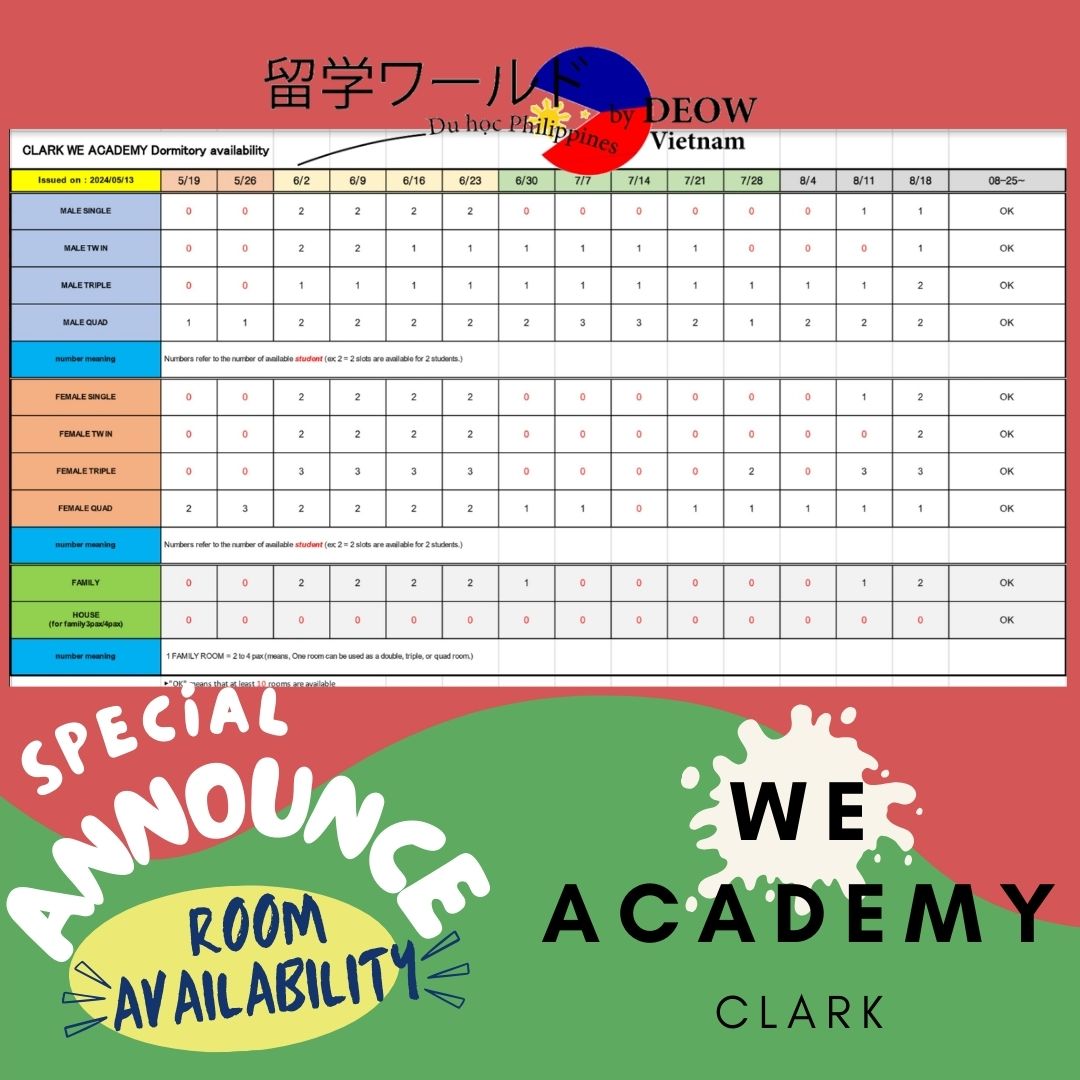 Để tiện cho việc theo dõi và đăng kí khóa học, DEOW VIETNAM Xin gửi đến QUÝ Anh/Chị danh sách phòng trống có sẵn tại Trường Anh Ngữ WE Academy Clark (Tháng 3/2025)