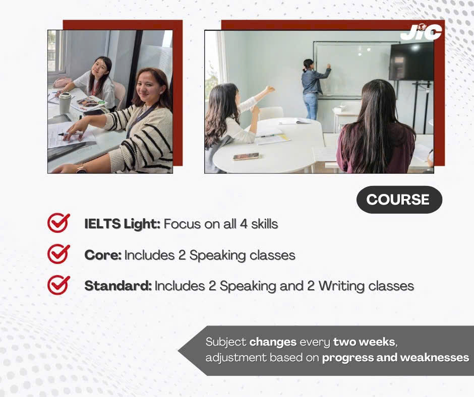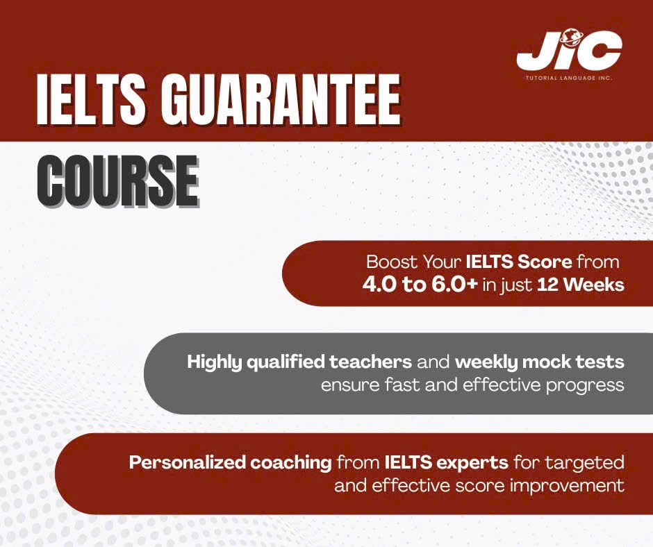 Bạn đang cần chinh phục IELTS trong thời gian ngắn? Khóa IELTS Guarantee 12 tuần tại JIC là lựa chọn lý tưởng dành cho bạn. Với chương trình đào tạo chuyên sâu, giáo viên 1:1 có chứng chỉ quốc tế, học viên sẽ được rèn luyện đầy đủ 4 kỹ năng và tham gia thi thử hàng tuần. Đặc biệt, JIC cam kết kết quả đầu ra, miễn phí học thêm nếu chưa đạt điểm mục tiêu — một giải pháp học tiếng Anh vừa hiệu quả, vừa tiết kiệm!