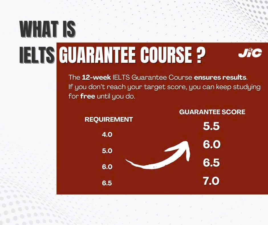 Thông tin khóa IELTS Guarantee 12 tuần hiện tại đang được triển khai tại JIC. Chương trình được thiết kế dành riêng cho học viên cần tăng điểm nhanh và có mục tiêu rõ ràng.
