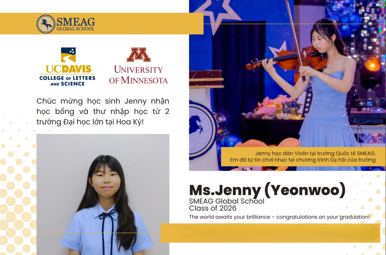Điều khiến nhiều phụ huynh yên tâm khi tìm hiểu về SMEAG chính là những kết quả thực tế mà học sinh của trường đạt được. Một ví dụ tiêu biểu là bạn Yeonwoo – học sinh đã theo học tại trường từ lớp 9 đến lớp 12. Khi mới bắt đầu, bạn chưa tự tin về khả năng tiếng Anh, thậm chí còn gặp khó khăn trong giao tiếp. Thế nhưng sau 4 năm học tập và rèn luyện trong môi trường quốc tế, Yeonwoo đã có sự thay đổi rõ rệt. Bạn có thể tự tin thuyết trình, viết luận bằng tiếng Anh và tham gia nhiều hoạt động ngoại khóa. Đặc biệt, bạn còn nhận được thư mời nhập học và học bổng từ hai trường đại học danh tiếng tại Mỹ là University of California, Davis và University of Minnesota Twin Cities. Đây không chỉ là thành công cá nhân mà còn là minh chứng rõ ràng cho chất lượng đào tạo của nhà trường.