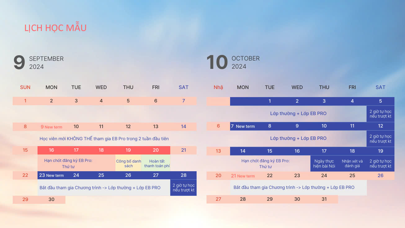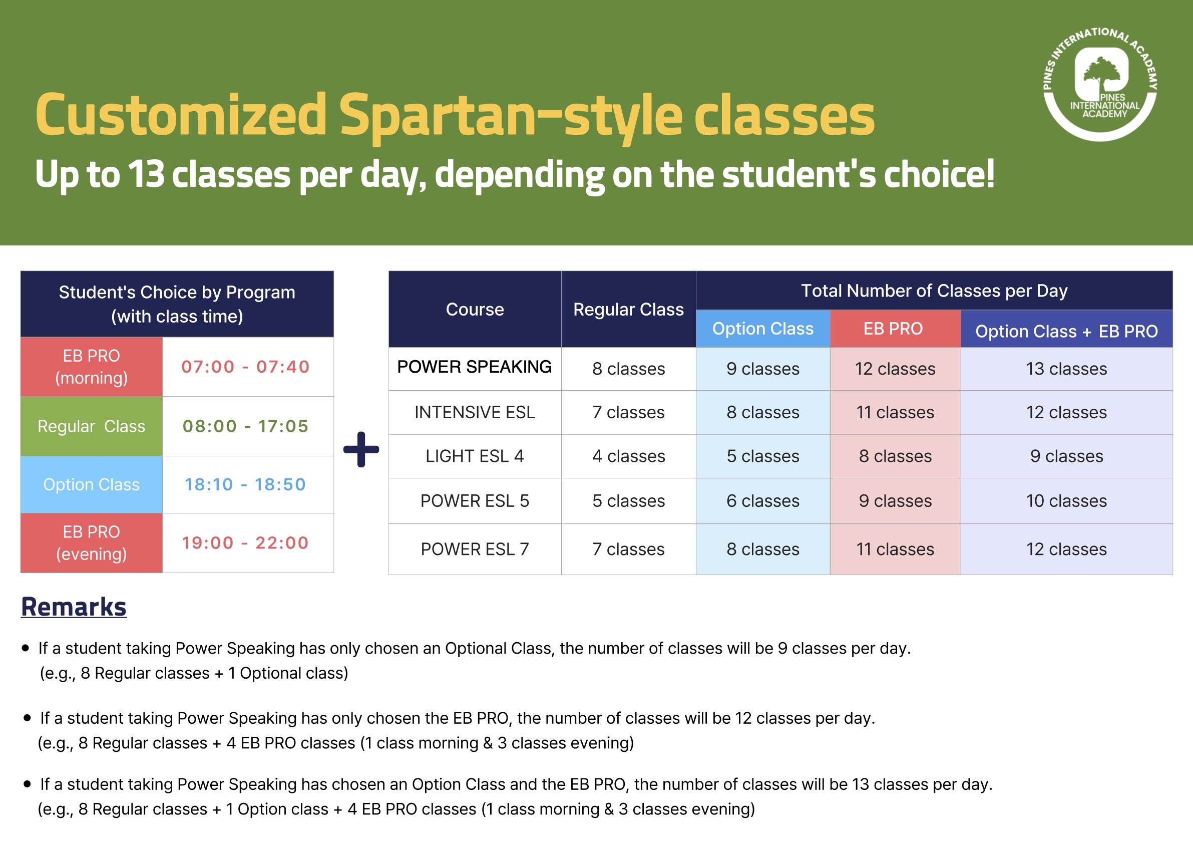 EB PRO là lớp học buổi tối bao gồm các bài học và bài kiểm tra từ vựng thường xuyên hàng ngày, các mục tiêu đầu ra mong đợi như nói trước công chúng và lịch học thiết kế theo phương pháp Sparta, cho phép học viên cải thiện chuyên sâu các kỹ năng của mình bên cạnh các lớp học thông thường.