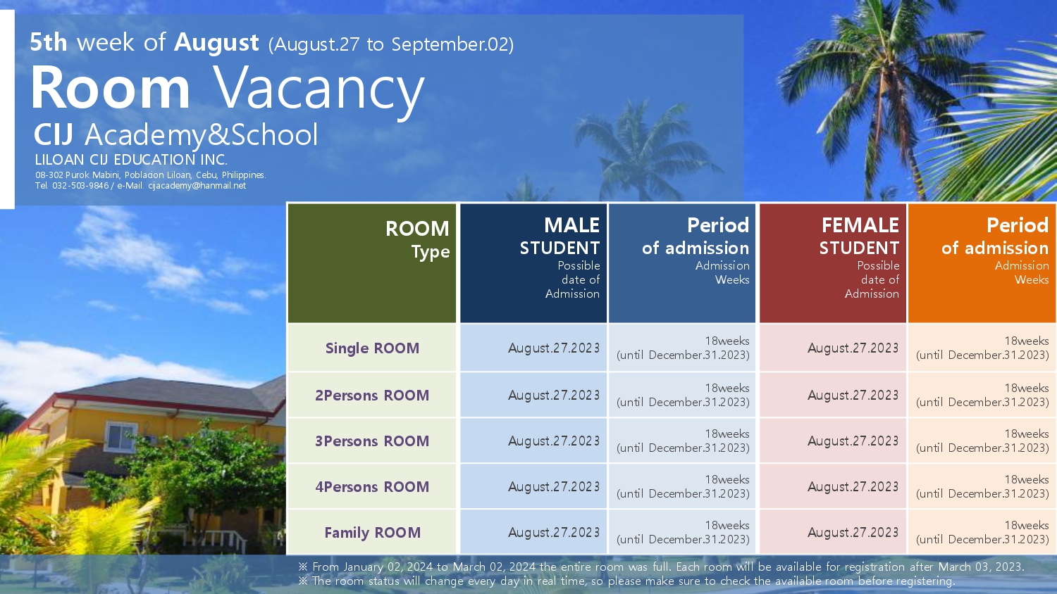 Ngoài ra, trường CIJ sẽ có một số thay đổi từ ngày 1 tháng 9 năm 2023. Tỷ lệ chỗ ở tại khuôn viên CIJ Liloan Campus sẽ được điều chỉnh. Điều này là một bước cần thiết nhằm đảm bảo cung cấp các chương trình và dịch vụ cao cấp cho các học viên. (Xem thêm thông tin bên dưới)