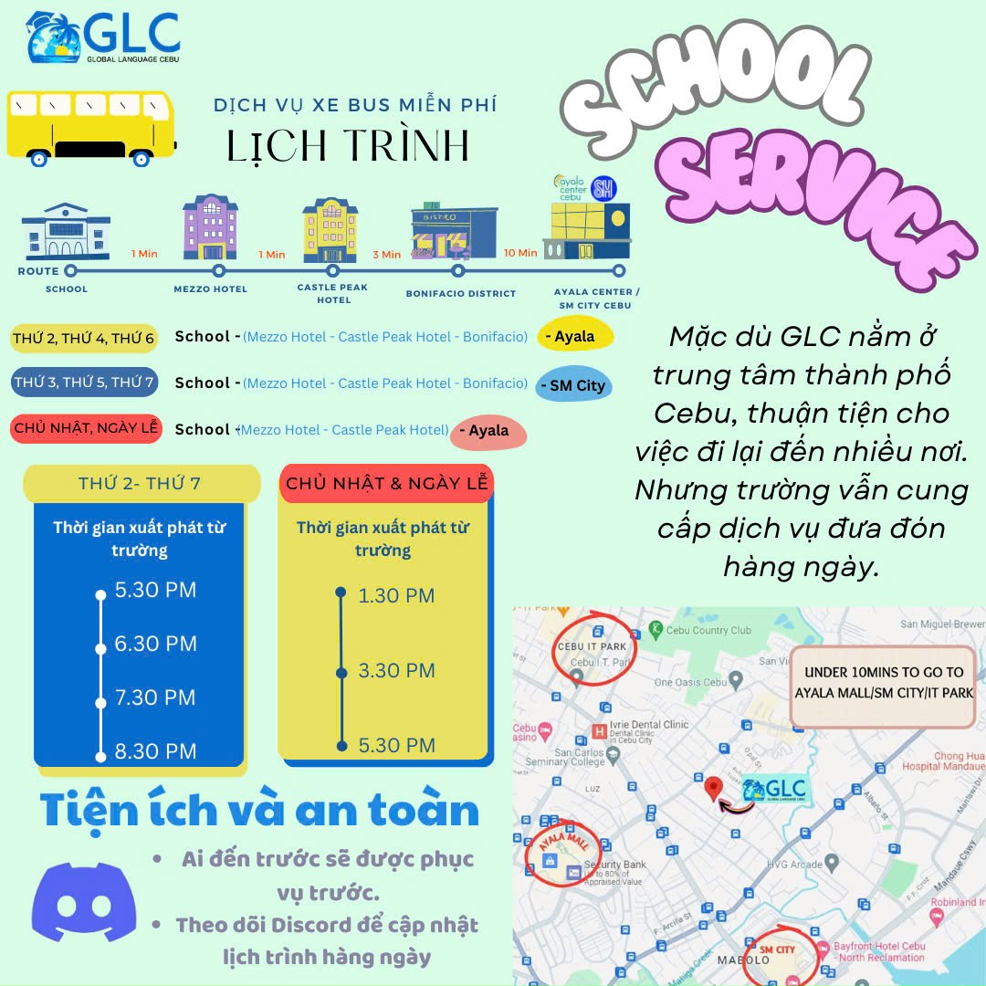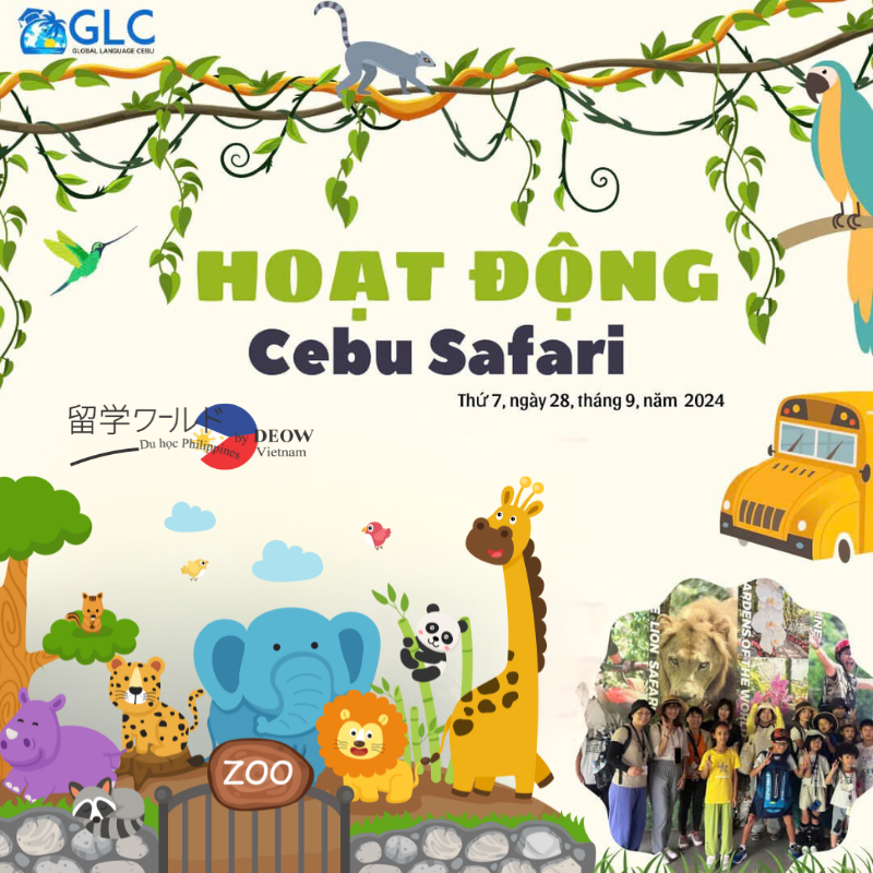 Bạn có thích những loài động vật hoang dã lớn hay những loài chim xinh đẹp không? Bạn có muốn tiếp xúc gần gũi với chúng? Nếu có, GLC đã sắp xếp một hoạt động cuối tuần cho tất cả học viên tại Công viên Safari Cebu. Thứ Bảy, trường sẽ đưa học viên đến Công viên Safari ở phía bắc Cebu. Học viên sẽ được dạo bước trên núi và ngắm nhìn nhiều loài động vật hoang dã đến từ châu Phi xa xôi, thậm chí có thể tiếp xúc gần với chúng. Nếu bạn là người yêu động vật hoang dã, đừng bỏ lỡ cơ hội này!