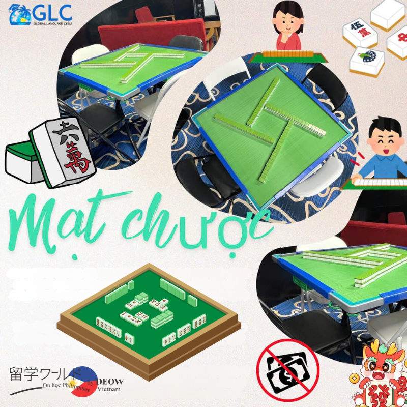 GLC có lẽ là trường đầu tiên ở Cebu chuẩn bị trò chơi mạt chược ngay trong khuôn viên trường. Nhằm làm phong phú cuộc sống sau giờ học của học viên, trường đã sắp xếp trò chơi mạt chược rất độc đáo. Tất cả học viên trên 18 tuổi có thể trải nghiệm trò mạt chược tại khu vực giải trí của phòng tập, và mỗi người sẽ có một giờ trải nghiệm trên mỗi bàn chơi. Tuy nhiên, GLC tuyệt đối không cho phép bất kỳ hành vi cá cược nào xảy ra, nếu vi phạm, bạn sẽ bị cấm tham gia trò chơi mạt chược vĩnh viễn và thậm chí có thể nhận cảnh cáo!