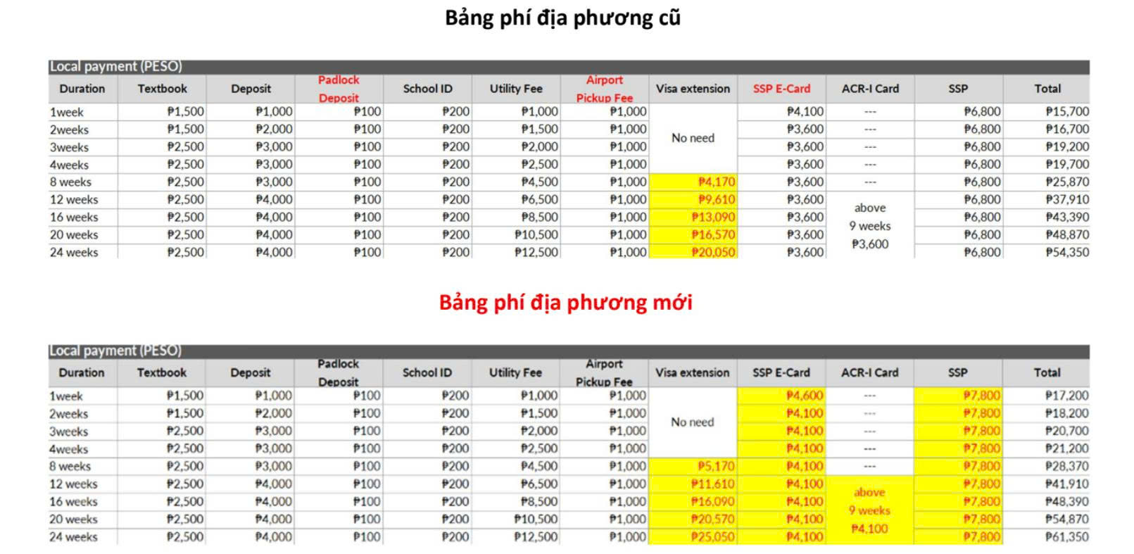 ● Utility fee (Phí tiện ích): Trang trải chi phí cơ sở vật chất của trường như điện, nước, Wi-Fi. 1.000 PHP/tuần (500 PHP x tuần lưu trú + 500 PHP)