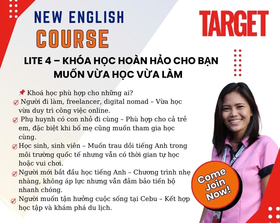 DEOW xin trân trọng giới thiệu khóa học LITE 4 – chương trình học tiếng Anh mới tại Target Global English Academy, được thiết kế đặc biệt dành cho học viên muốn kết hợp giữa học tập và làm việc từ xa. Đây là lựa chọn lý tưởng cho những ai tìm kiếm một khóa học chất lượng với mức học phí tiết kiệm nhất.