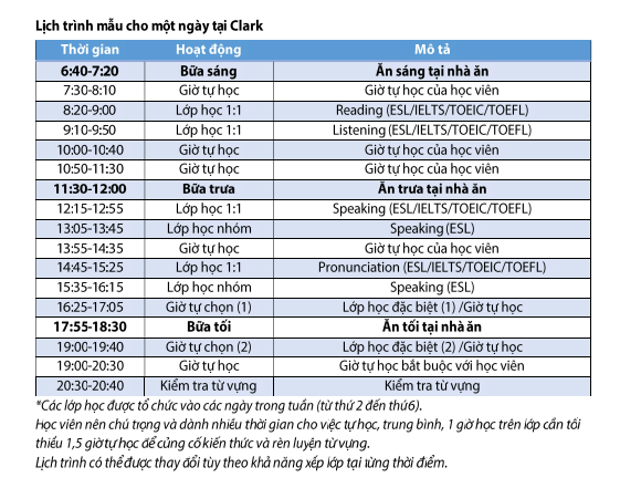 - Học viên đi học đầy đủ các lớp học theo lịch (4-5 lớp 1:1, lớp nhóm và lớp special) và tham gia kiểm tra VOCA Test vào buổi tối. Từ thứ Hai đến thứ Tư, học viên có thể tham gia học thứ bất kỳ lớp special nào. Từ thứ năm trở đi, học viên học lớp special nào thì sẽ theo học lớp đó luôn tới hết tháng.