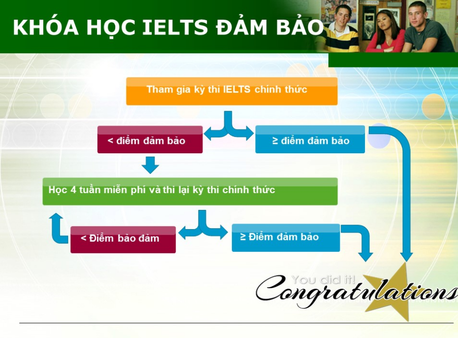 Sau khi bạn đạt được cột mốc IELTS 4.0, bạn sẽ bắt đầu chương trình học IELTS đảm bảo chính thức Sau thời gian học này, bạn sẽ tham gia kỳ thi IELTS chính thức. Nếu kết quả bạn đạt được số điểm như kỳ vọng ban đầu, chúc mừng bạn đã đạt được mục đích của mình và tốt nghiệp. Tuy nhiên, nếu bạn chưa đạt được số điểm như kỳ vọng, bạn sẽ tiếp được học miễn phí tại trường trong 4 tuần tiếp theo (chỉ đóng tiền ăn ở) và tham gia kỳ thi chính thức tiếp theo sau 4 tuần. Và lặp lại cho đến khi bạn đủ điểm IELTS mà bạn mong muốn.