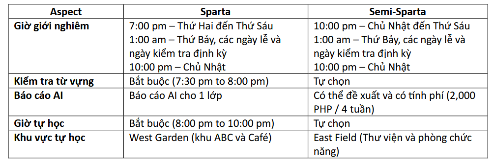 Self-Study Proctor (Giám thị giám sát trong giờ tự học): Các học viên Sparta trong giờ tự học sẽ được giám sát bởi một giáo viên giám thị và được trả lời các câu hỏi cần thiết. Đối với học viên Semi-Sparta sẽ không có giám thị kiểm soát, tuy nhiên sẽ có nhân viên hỗ trợ để đảm bảo trật tự khu vực.