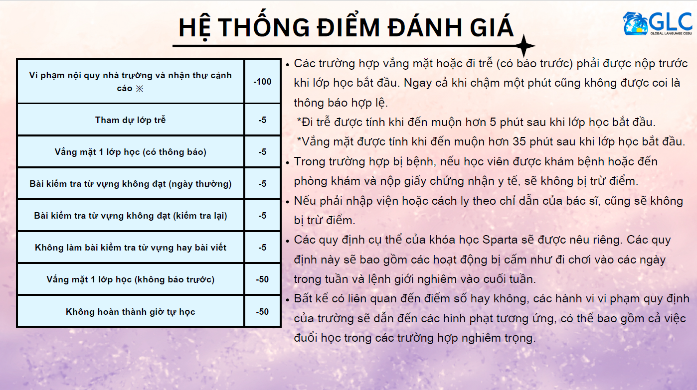 - Điểm sẽ bị trừ dựa trên việc điểm danh, bài kiểm tra từ vựng, bài luận, việc tuân thủ của học viên và tiến độ chương trình học.