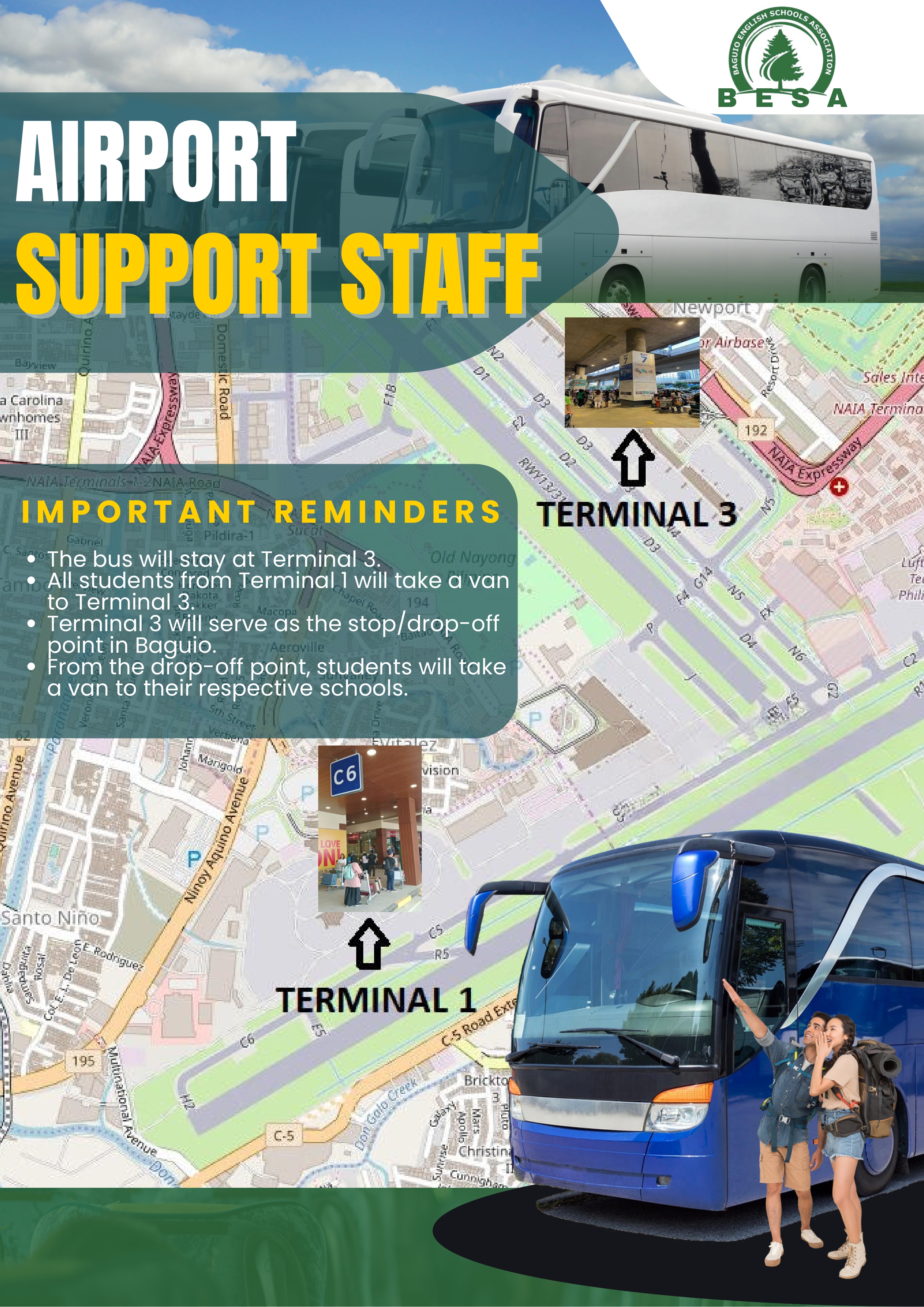 - Học sinh đến Nhà ga số 1 sẽ được chuyển đến Nhà ga số 3 bằng xe của BESA, gặp nhau vào thời gian quy định, và sau đó cùng lên xe buýt