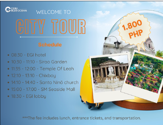 🚗 City Tour: sẽ được tổ chức vào thứ 7 tuần đầu tiên học viên nhập học (1 lần/ 1 tháng), học viên sẽ được tham quan cảnh đẹp của thành phố Cebu để hiểu rõ hơn về con người và đời sống tại Philippines (học viên sẽ phải trả phí khi tham gia)