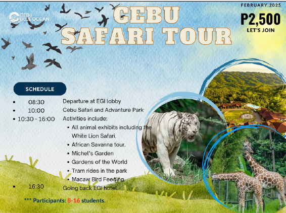 🦊 Cebu Safari Tour: sẽ được tổ chức vào thứ 7 của tuần đầu tiên nhập học (1 lần/ 1 tháng), học viên sẽ được ngắm nhìn những động vật có trong tự nhiên.