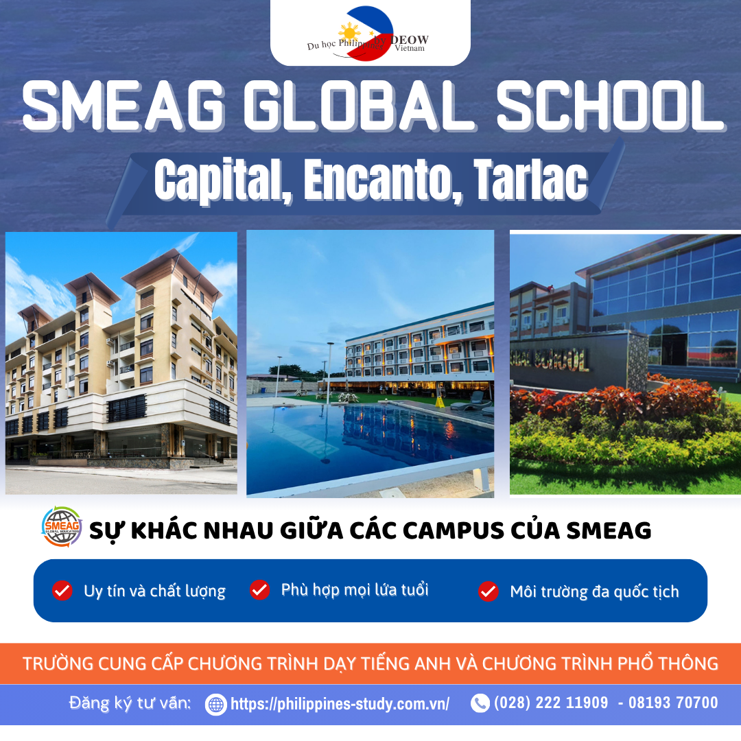 SMEAG Global School là hệ thống trường Anh ngữ nổi tiếng tại Philippines với 3 cơ sở phù hợp cho nhiều đối tượng học viên có các mục đích học tập khác nhau. SMEAG mong muốn đem lại môi trường học tập thoải mái và đúng mục đích nhất để học viên có thể dễ dàng nâng cao khả năng tiếng Anh trong thời gian học tập tại đây. 3 cơ sở của SMEAG là Capital, Encanto và Tarlac.