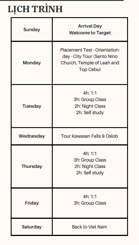 Target Campus tọa lạc tại Trung tâm thành phố Cebu với mức học phí tiết kiệm có thể đáp ứng được nhu cầu của nhiều đối tượng học viên. Năm 2025, Target cho ra mắt Chương Trình Hè 1 Tuần có mức chi phí vừa phải với nhiều nội dung hấp dẫn. Hãy cùng theo chân DEOW tìm hiểu nhé!