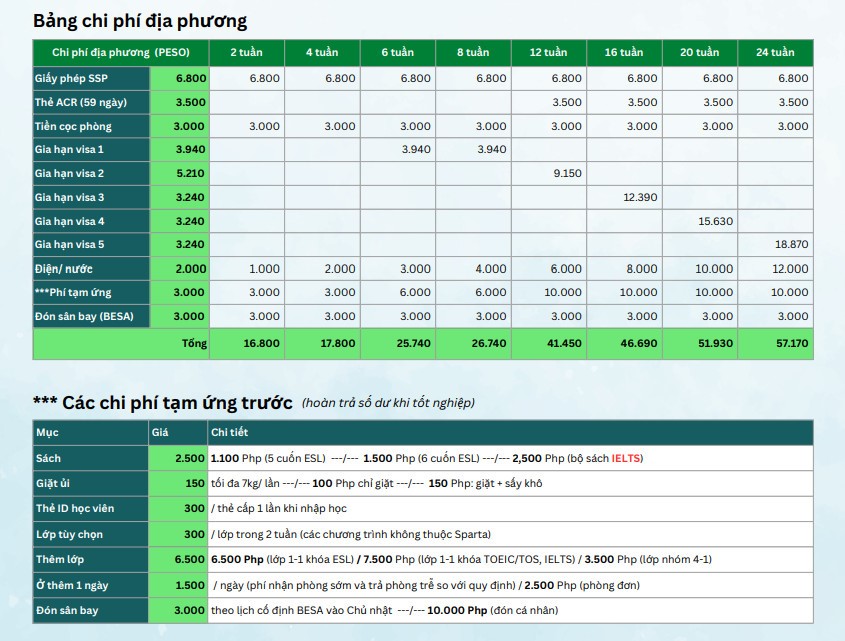 - Học viên nhập học từ 1/7 cần chuẩn bị thêm phần chi phí thẻ I-Card kèm với bảng chi phí địa phương hiện tại