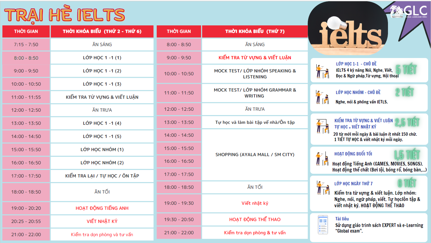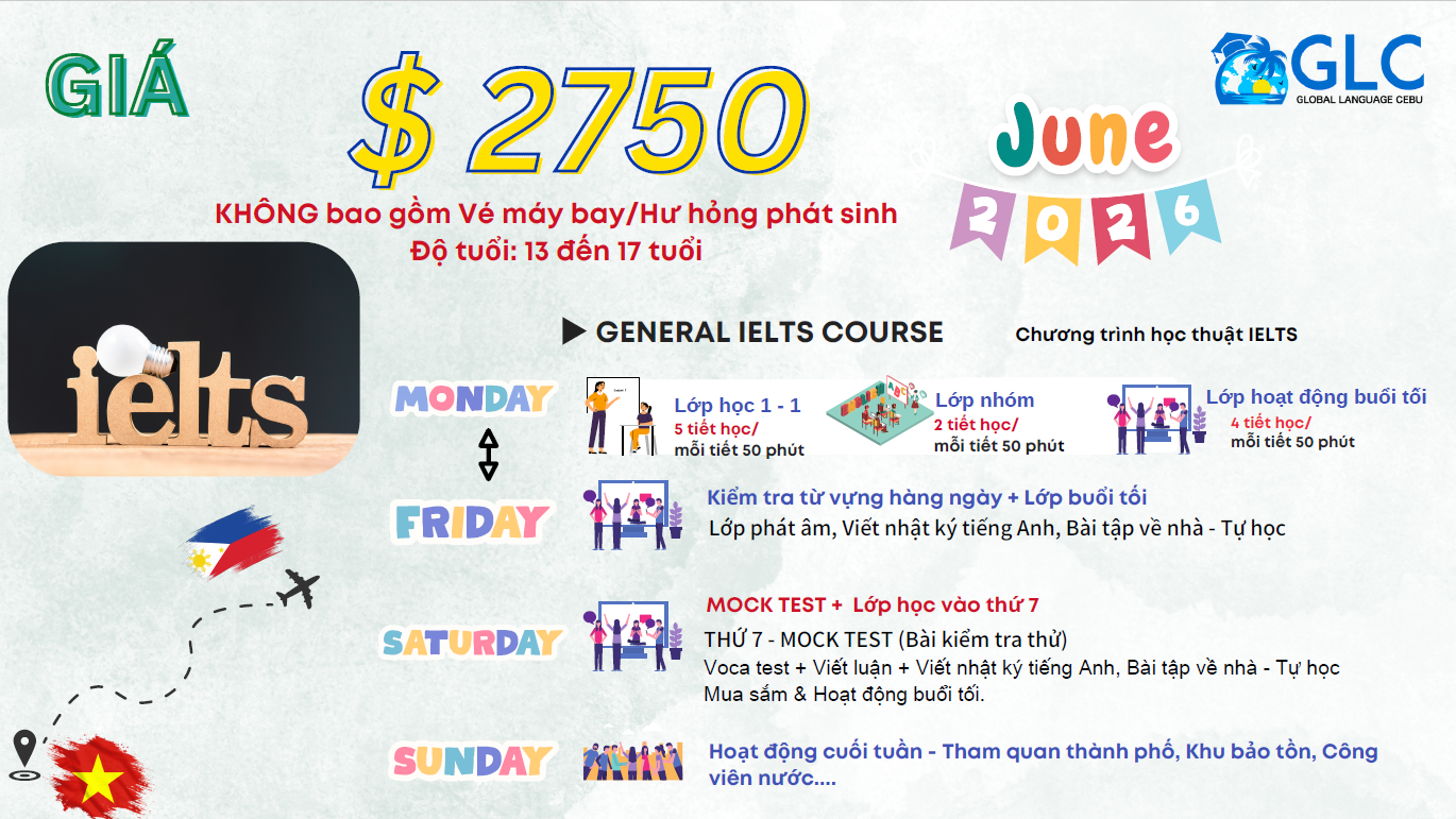 Hàng năm, GLC tổ chức chương trình " TRẠI HÈ GLC 2026" với phương châm giúp các con tận hưởng mùa hè thoải mái, khám phá đất nước Philippines xinh đẹp thú vị mà vẫn cải thiện và nâng cao kỹ năng tiếng Anh, làm quen với bài thi IELTS – một hệ thống bài kiểm tra về khả năng sử dụng thành thạo tiếng Anh trải dài qua cả bốn kĩ năng Nghe, Nói, Đọc, Viết.