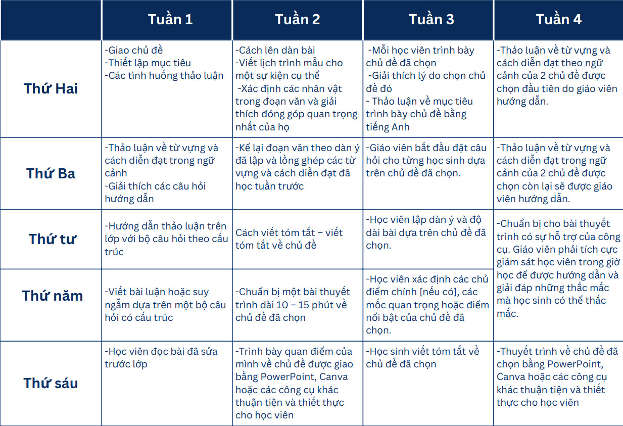 Trong hai tuần đầu tiên của học kỳ, các chủ đề cần đọc, thảo luận và trình bày sẽ do giáo viên hướng dẫn chi tiết. Tuy nhiên, trong tuần thứ 3 và thứ 4, học sinh sẽ chọn chủ đề của riêng mình, tổ chức thảo luận và chuẩn bị cho bài thuyết trình chính thức vào tuần thứ 4.