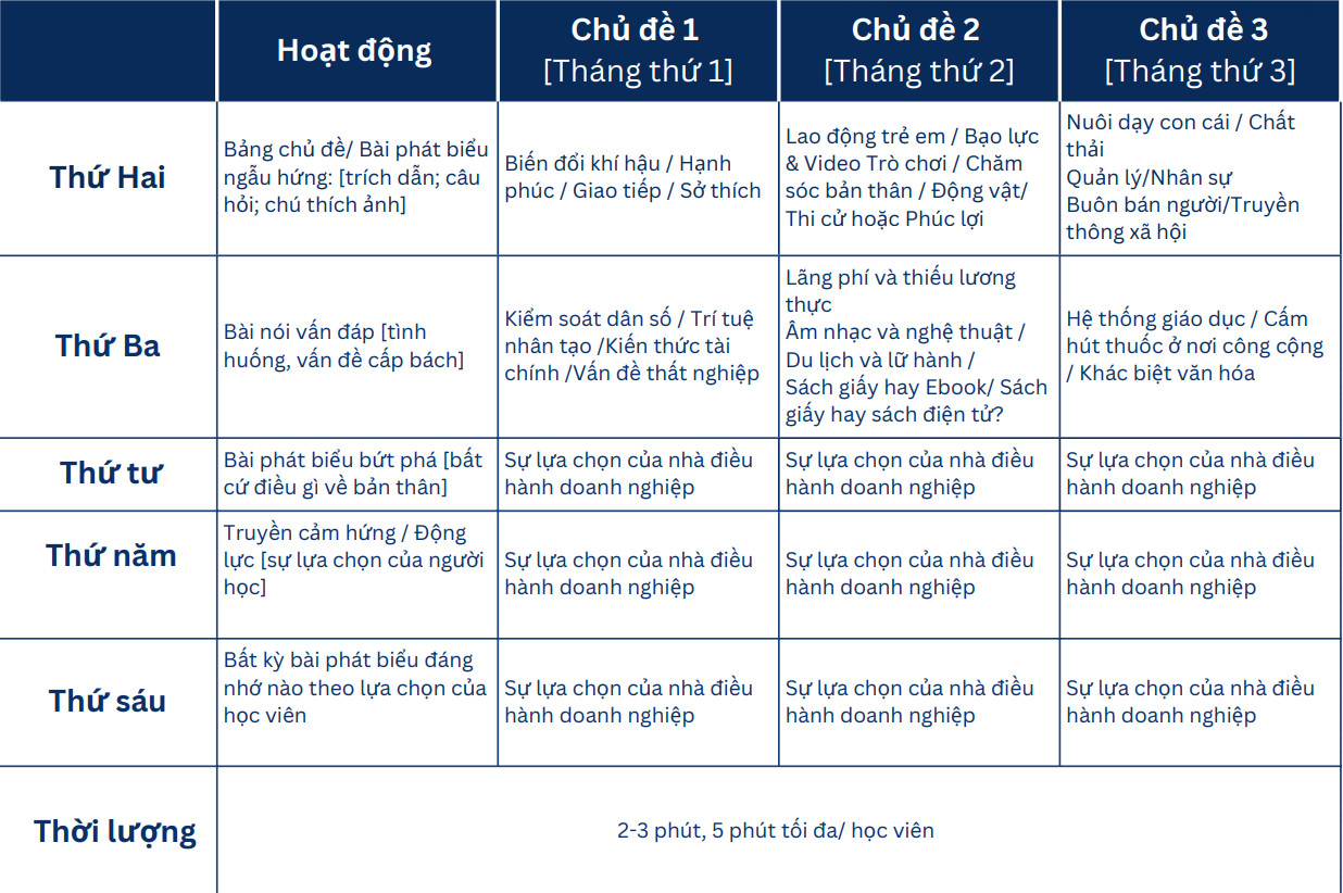 Lớp học này dành cho các nhà điều hành doanh nghiệp thực hành nói về các chủ đề khác nhau được gợi ý bằng các câu trích dẫn, câu hỏi, hình ảnh, chú thích hình ảnh, tình huống và các vấn đề cấp bách trên toàn cầu. Khóa học cũng cung cấp một cơ hội để người học trình bày một bài nói chuyện về bản thân họ, chia sẻ suy nghĩ về các chủ đề truyền cảm hứng và động lực hoặc bất kỳ bài phát biểu nào họ đã ghi nhớ mà họ lựa chọn. Thông qua lớp học này, người học được tự do khám phá các chủ đề mà họ quan tâm và phát biểu về chủ đề đó.