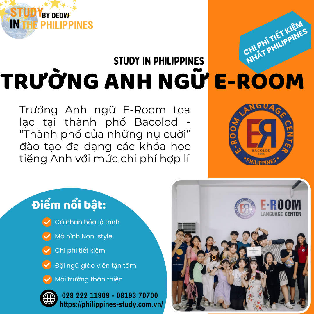 Trường Anh ngữ E-ROOM Language Center (E-ROOM LC) tọa lạc tại thành phố Bacolod – Philippines. Chuyên đào tạo đa dạng các khóa học tiếng Anh với mô hình học tập linh hoạt, không gian học tập thoải mái gần gũi với học viên. Trường giảng dạy với phương châm không biến việc học thành áp lực mà là cả một quá trình nhẹ nhàng, tự nhiên và đầy động lực. Học viên đến với E-Room sẽ vừa rèn luyện được tiếng Anh vừa trải nghiệm cuộc sống thú vị tại thành phố thân thiện và hiếu khách như Bacolod – Philippines.