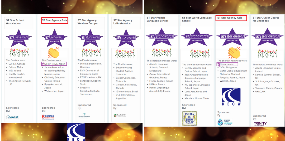 Deow Japan nhiều lần lọt vào danh sách đề cử ST Star Agency Châu Á - Giải thưởng các Đại lý tư vấn du học uy tín tại Châu Á do các Tổ chức giáo dục và Trường học trên toàn Thế Giới bình chọn trong năm 2018-19 và 2020-21