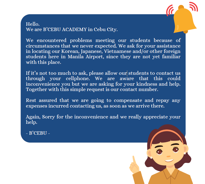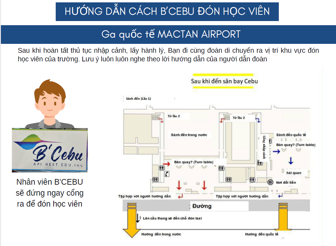 👉 Khi đến sân bay Cebu, học viên lấy hành lý và ra cửa sân bay, sẽ có nhân viên cầm bảng “B’CEBU” của trường đến đón học viên đứng đợi bên ngoài.