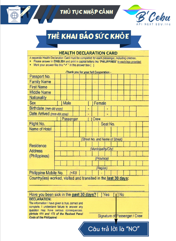 Đến quầy hải quan Philippines, lúc này học viên sẽ được hỏi nơi bạn sẽ ở khi đến Philippines (B’CEBU ACADEMY) và thời gian lưu trú tại Philippines (4 weeks)