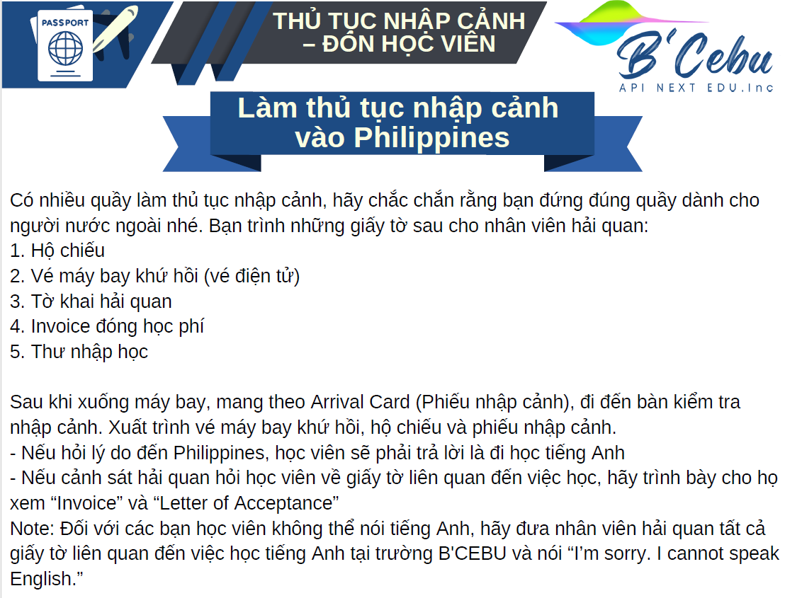 Du học tiếng Anh tại Philippines sẽ là bước tiến lớn cho học viên nâng cao trình độ tiếng Anh nhanh chóng đồng thời đưa học viên tiếp cận tới nền giáo dục quốc tế. Hành trang cần chuẩn bị và các hướng dẫn sẽ được API BECI – B’CEBU cập nhật để Quý phụ huynh và học viên nắm rõ. Ngoài ra B’CEBU cũng sẽ thông tin về các quy trình nhập cảnh tại sân bay Philippines.