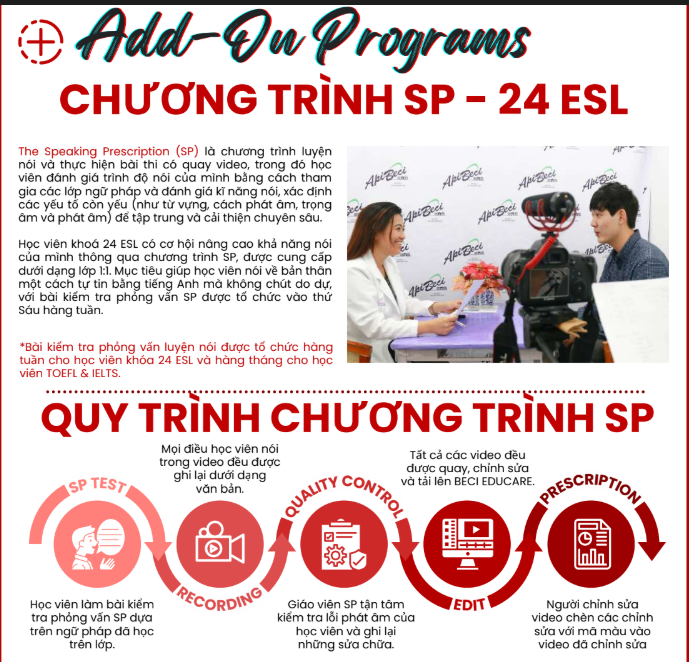 - Chương trình SP : chương trình Speaking Prescription (SP) sẽ giúp cải thiện kĩ năng nói thông qua việc tự đánh giá bằng bài kiểm tra có quay video. Nhằm mục đích cải thiện từ vựng, cách diễn đạt, nhấn giọng, phát âm thông qua bài phỏng vấn giao tiếp.