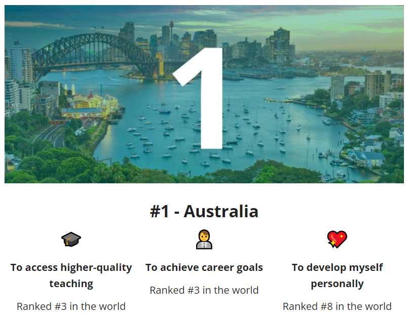 Trong năm 2022, Úc đã chiếm vị trí hàng đầu từ Canada về điểm đến thu hút du học sinh nhiều nhất toàn cầu với 9 địa điểm đặc sắc và 20 di sản thế giới được UNESCO công nhận. Ngoài ra, Úc cũng xếp hạng 3 trên toàn thế giới về tiếp cận với chất lượng giảng dạy cao và tỉ lệ đạt được mục tiêu nghề nghiệp.