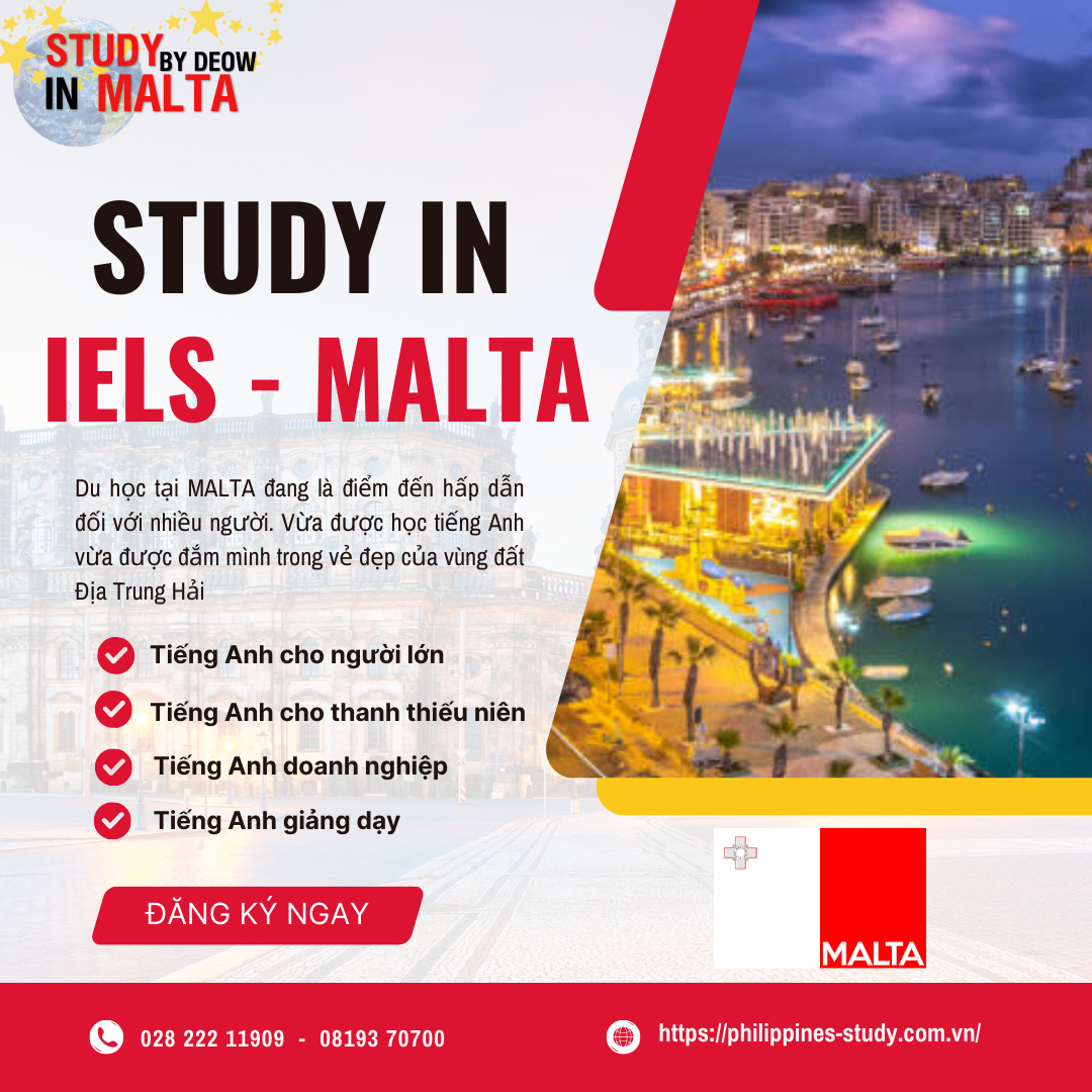 Malta là một quốc gia đảo nhỏ nằm ở trung tâm Địa Trung Hải nổi tiếng với lịch sử lâu đời, nền văn hóa phong phú. Đây là quốc gia đầy sức hút ở Địa Trung Hải, hiện nay Malta là điểm đến du lịch hàng đầu và đã trở thành trung tâm tài chính quốc tế ở khu vực này. IELS (Viện Nghiên cứu Ngôn ngữ Anh) được thành lập vào năm 1985 tại trung tâm Sliema – trung tâm tài chính và du lịch của Malta. Trường đào tạo các khóa học tiếng Anh phù hợp với mọi trình độ. Các khóa học tại IELS được thiết kế để giúp học viên đạt được mục tiêu ngôn ngữ của mình.