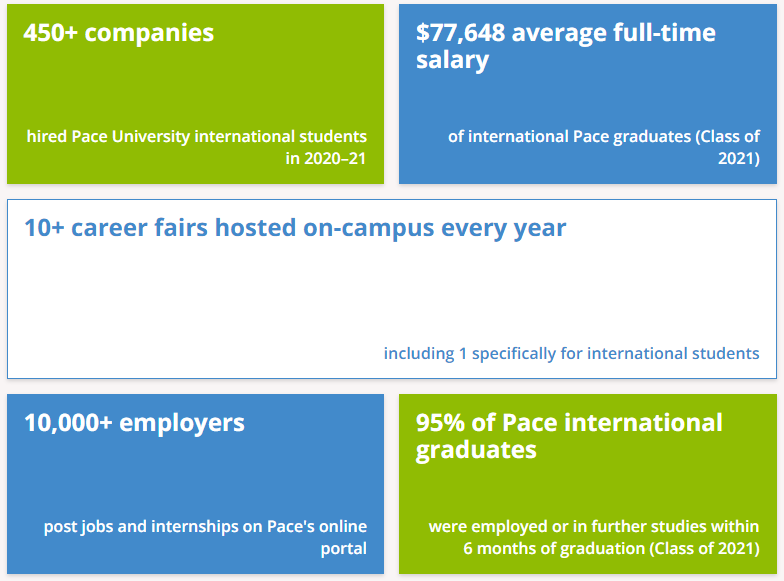 Được xếp hạng trong Top 100 về Employability (QS World University Rankings: USA 2021), Pace giúp sinh viên có được cơ hội thực tập và việc làm tuyệt vời thông qua các mối quan hệ chặt chẽ của bộ phận Career Services với tất cả các nhà tuyển dụng ở mọi lĩnh vực, bao gồm từ các công ty khởi nghiệp, tổ chức phi lợi nhuận đến các tập đoàn đa quốc gia.
